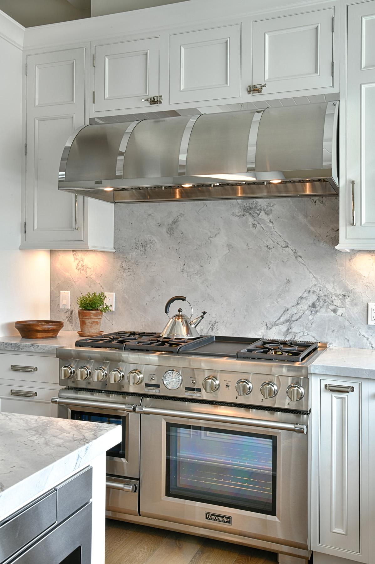 Full-height stone splashes of countertop material are Stratton’s client favorites too, he says. He’s also seeing more metal in range hoods, rather than cabinetry finishes. “The luxury market remains interested in having something special,” he points out, and they prefer to have these items custom made.