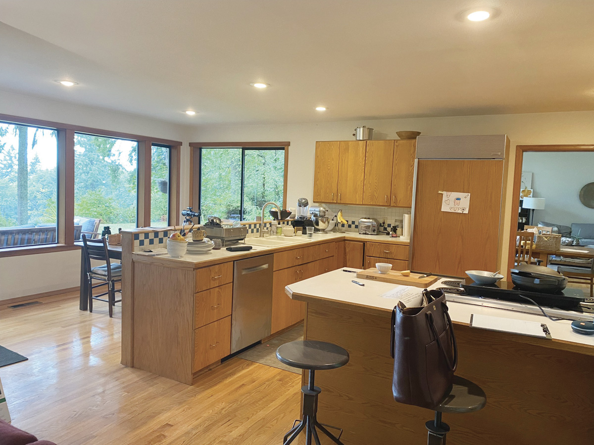 This kitchen in Vashon, WA saw its last major remodel at the beginning of the open concept craze of the 1980s – clearly evident from the telltale honey oak cabinetry, high-gloss floors and dated tile backsplash. An awkward wall forced one of the peninsulas into a bizarre, crooked angle, creating a serious interruption to workflow. The real tragedy of the outdated space, though, was that its strange angles and overwhelming yellow-orange tones detracted from the grand view showcased by a bank of windows on the west wall.