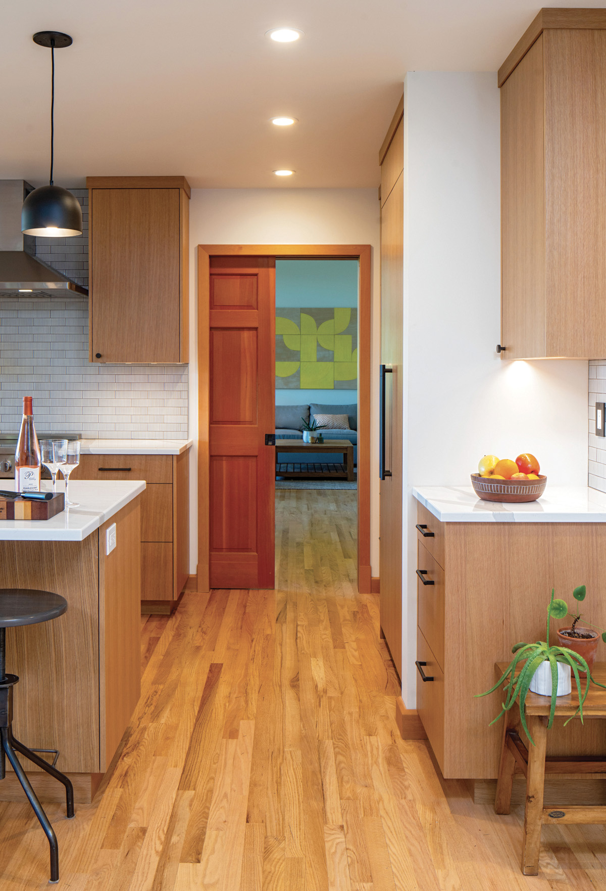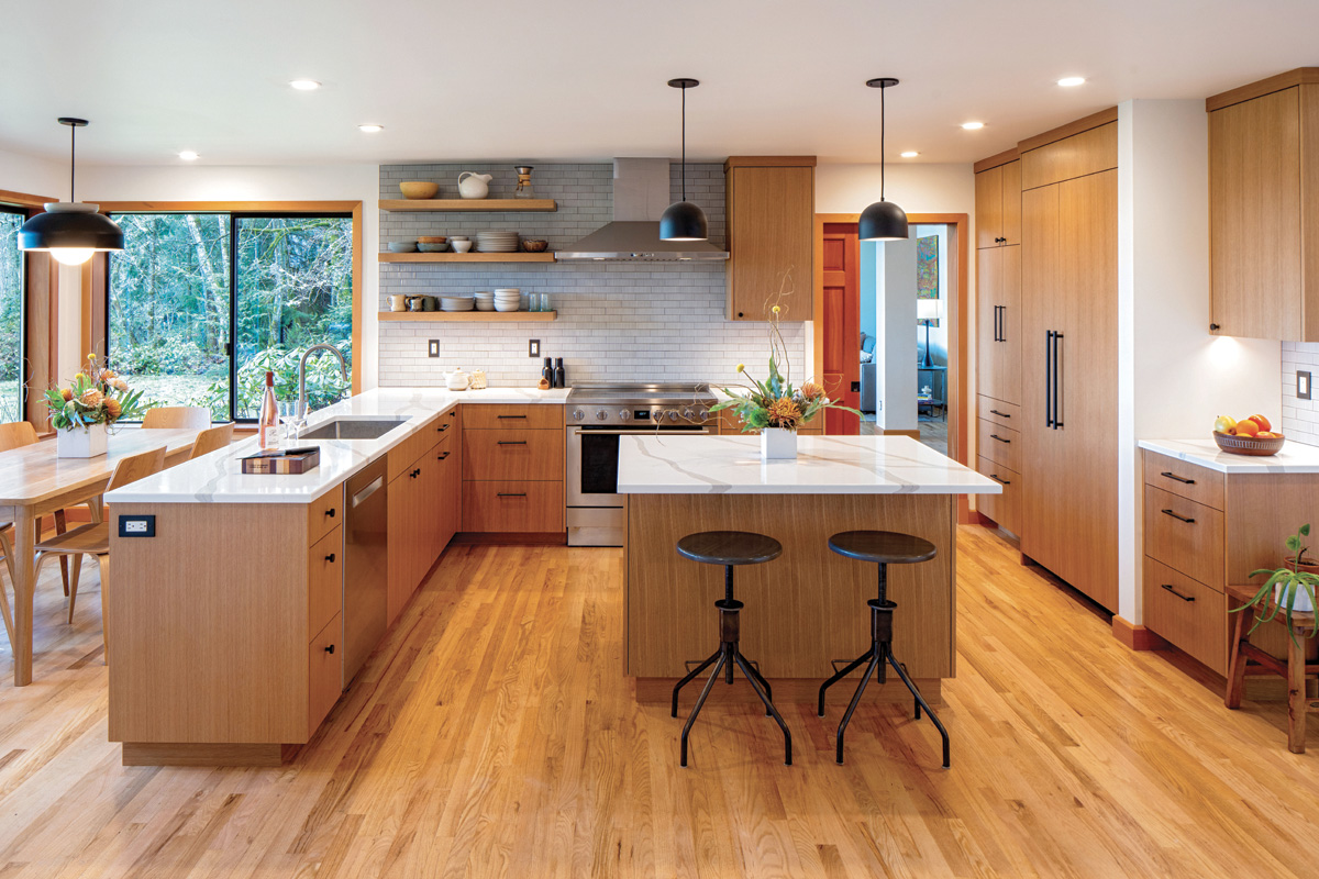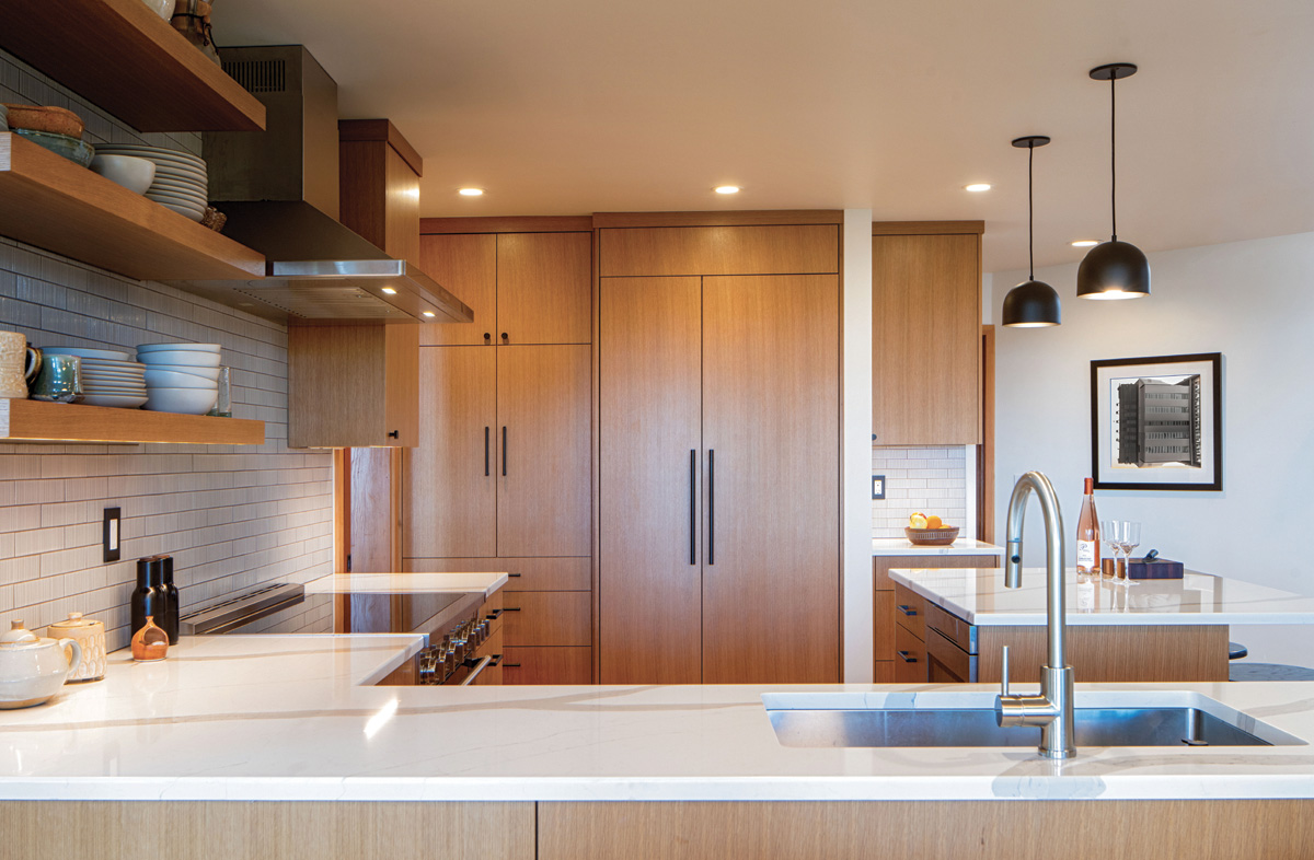 Designer Angie Harpole of Harpole Home drew inspiration from the outside view when choosing materials for the remodeled kitchen, selecting natural finishes to allow the beautiful vista to be the star of the space. An arabescato quartz countertop by Architectural Surfaces, combined with flat front cabinetry from Sound Woodworks, creates a refreshingly modern yet neutral backdrop for the view. Because another of the priorities for this remodel was to give the homeowner’s collection of handmade pottery a place to shine, the designer incorporated floating shelving against a full-height ceramic tile backsplash.