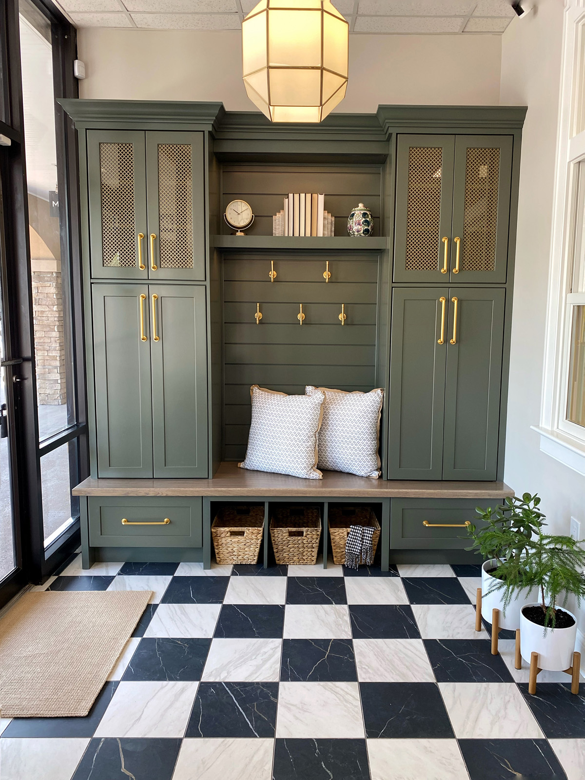 “The cabinets are the ‘wow’ factor,” Altieri says. “As soon as you enter the door, there is a beautiful olive green mudroom bench with white oak top and gold hardware – all made from a stock cabinet line, but with that custom flare. We have a bathroom display with a shower enclosure, showing what the curb and niche will look like in an install. We have a modern ‘wet’ bar with a Silestone quartz countertop and backsplash from Cosentino, constructed from frameless cabinetry in dark charcoal and white oak accents.