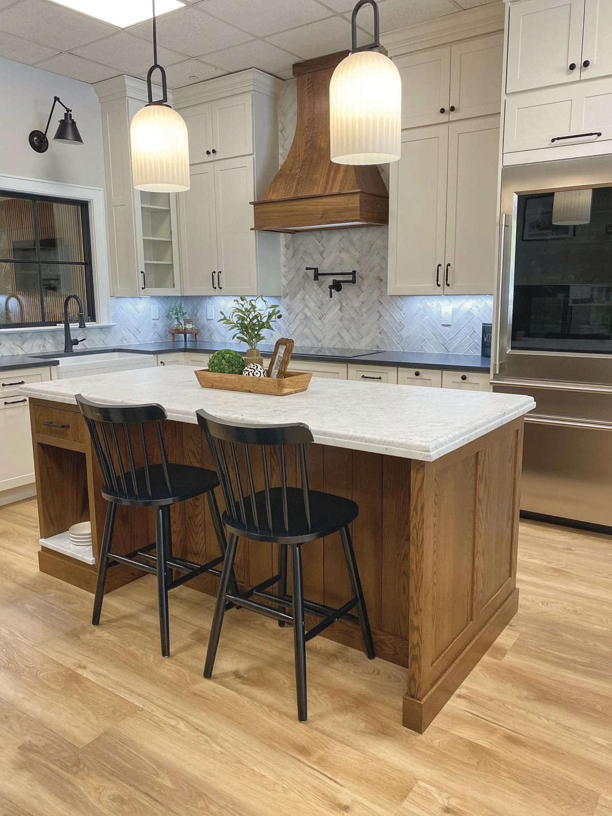 The kitchen display includes a custom oak island with inset doors and natural Carrara marble top with stacked 3″ edge.