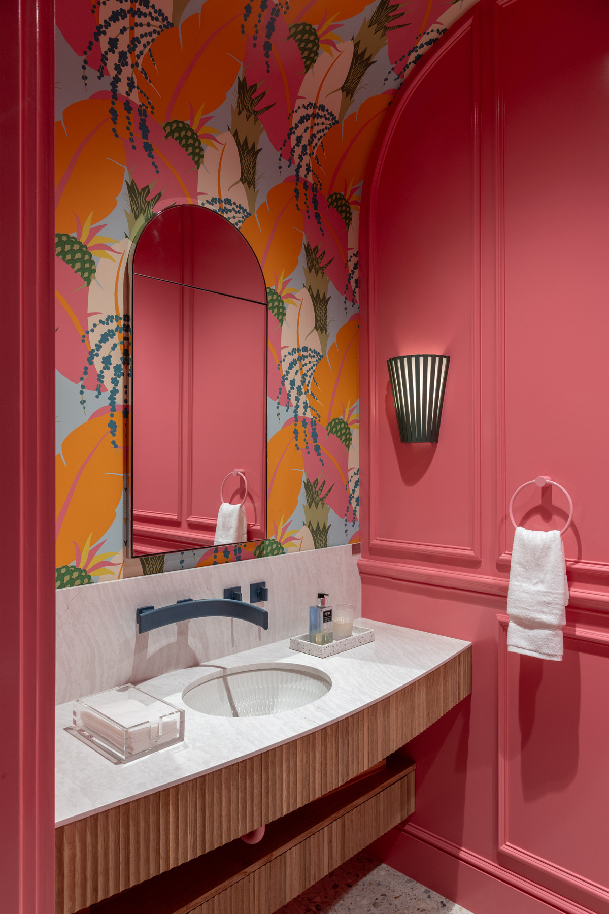 “The two bathrooms are actually really fun rooms, and probably the most collaborative between all of our designers,” Sutton offers. “They both meet the concept of color saturation and ‘cover all the sheetrock’ in the design. There are lots of fun elements, patterns and bold colors and design choices, even in the working ADA-compliant space. We love our pink grab bars!”