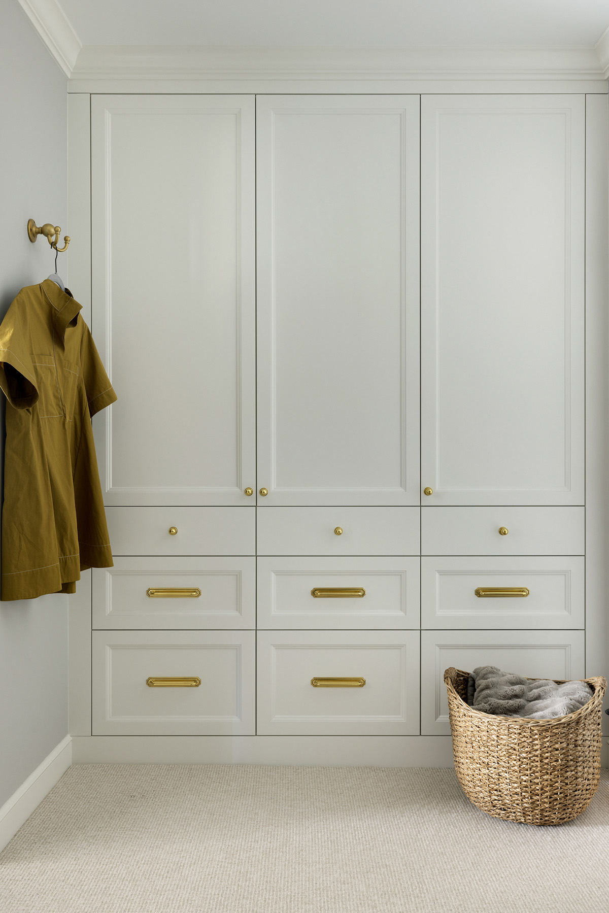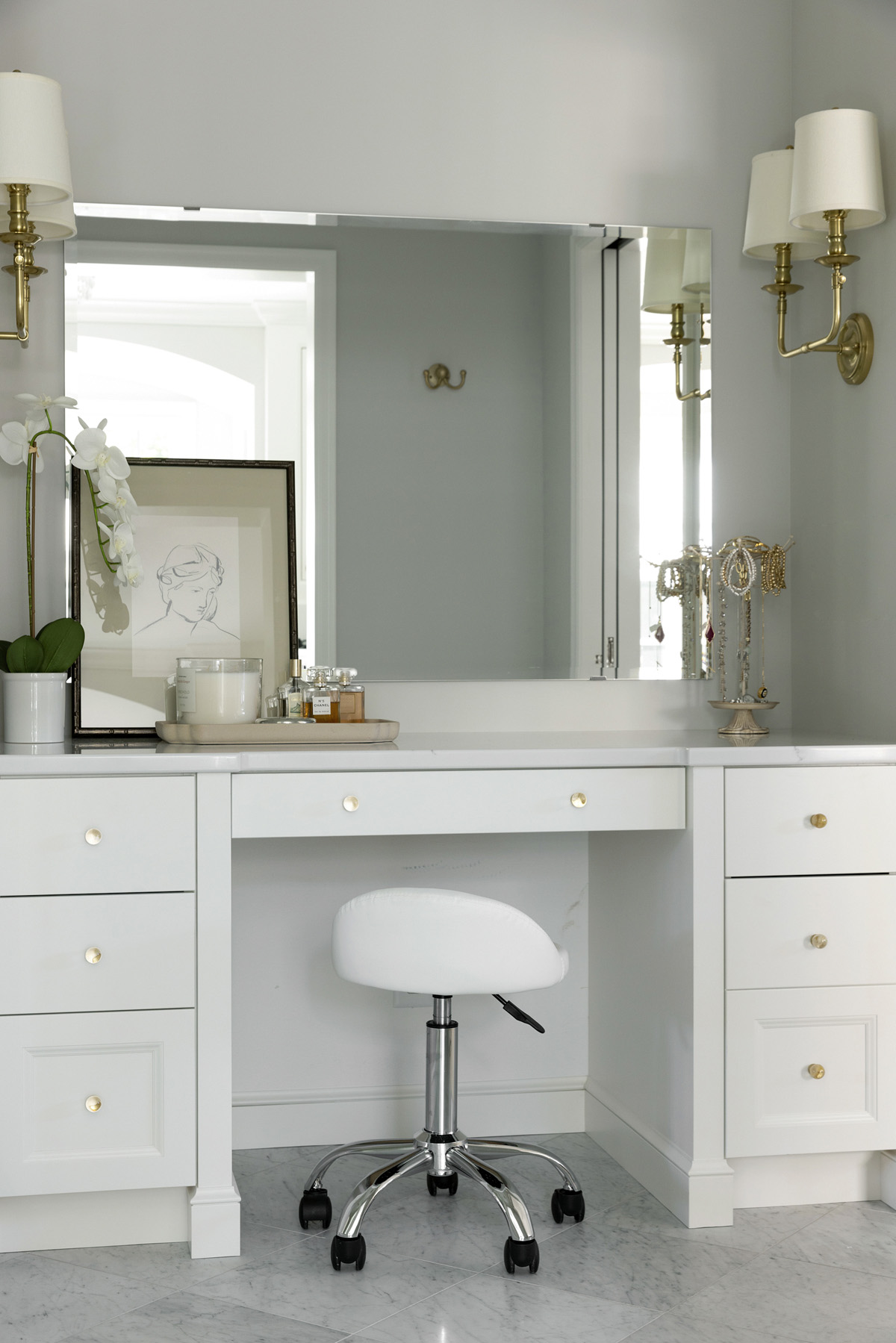A pull-out shelf was discreetly added for hidden storage, and a dedicated makeup vanity area was created for daily use.