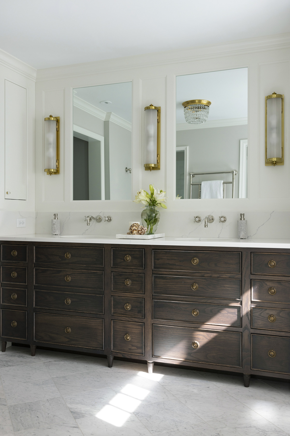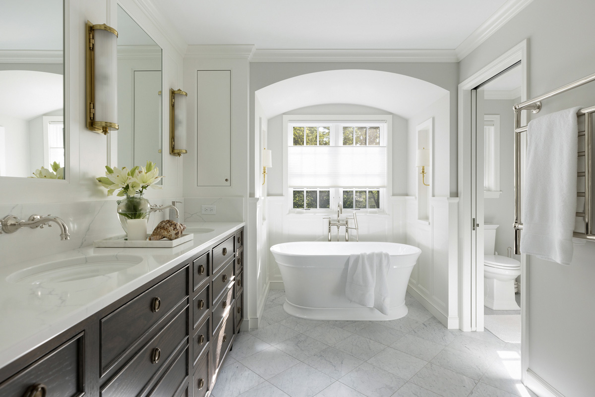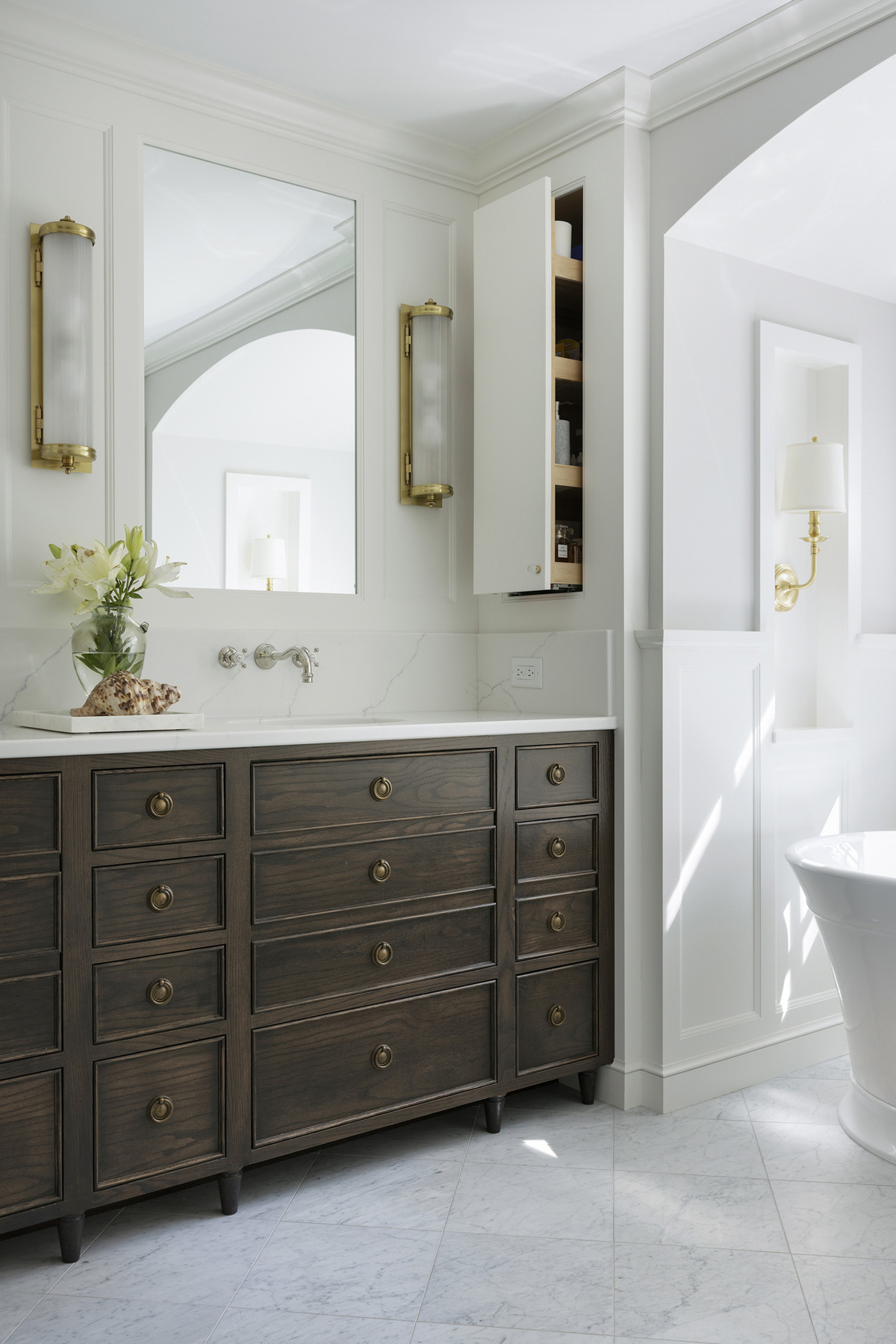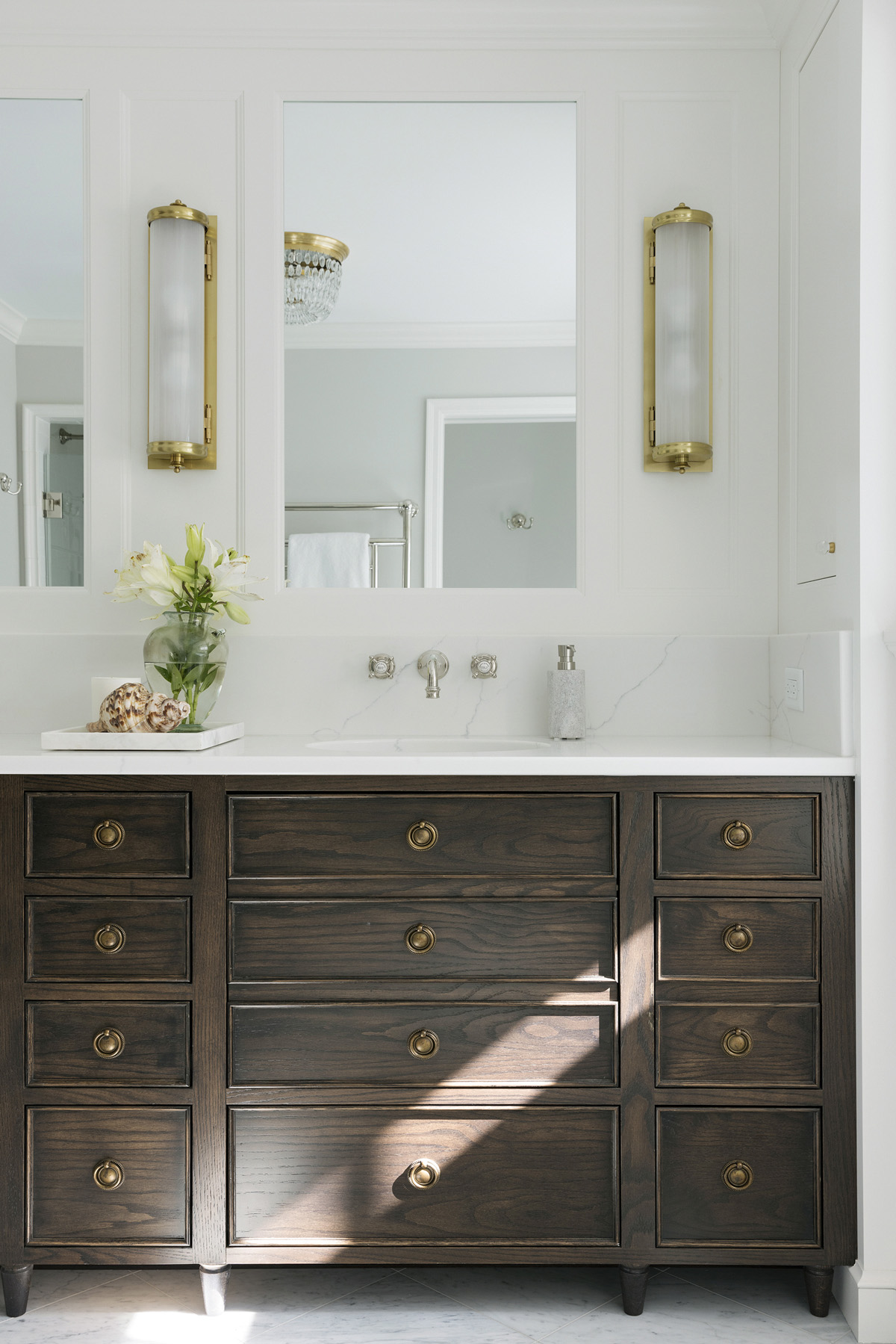 The bath vanity includes a Kohler Devonshire white sink, Perrin and Rowe Georgian Era wall-mount widespread faucet and MSI Q Quartz surface in Calacatta Miraggio. Built-in shelves were integrated on either side of the vanity to keep daily essentials within reach. Hudson Valley Bristol Sconces in Aged Brass provide illumination.