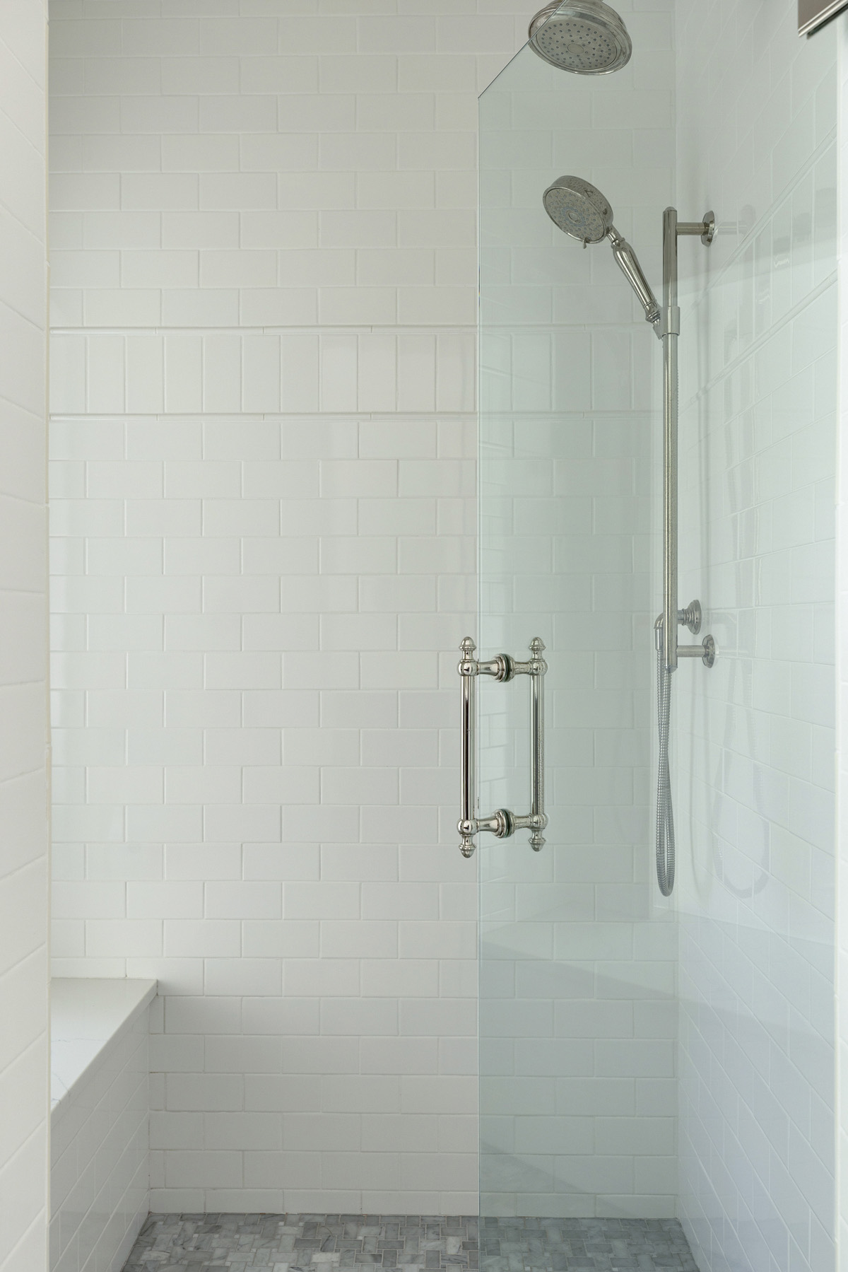 In the bathroom, the goals were to improve layout and storage while maintaining a clean design. The original footprint was functional but slightly too small for the new shower design, so it was expanded just enough to accommodate a walk-in shower with a built-in bench. The shower walls and ceiling feature Sonoma Tilemakers Pure Subway tiles, while the shower floor is Carrara marble tile in a basketweave mosaic. Kohler shower fixtures in Vibrant Polished Nickel and Polished Nickel add shine and function.