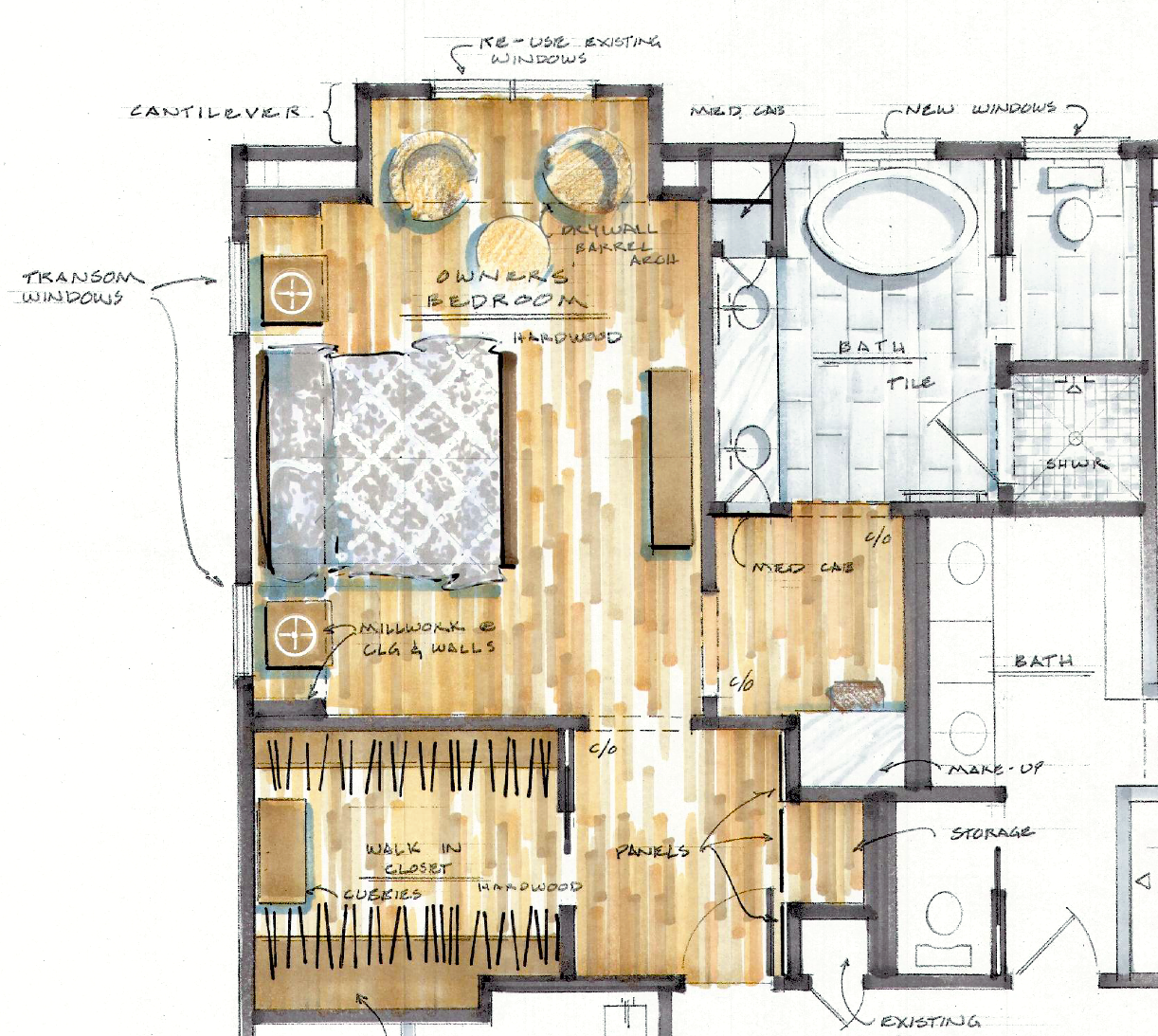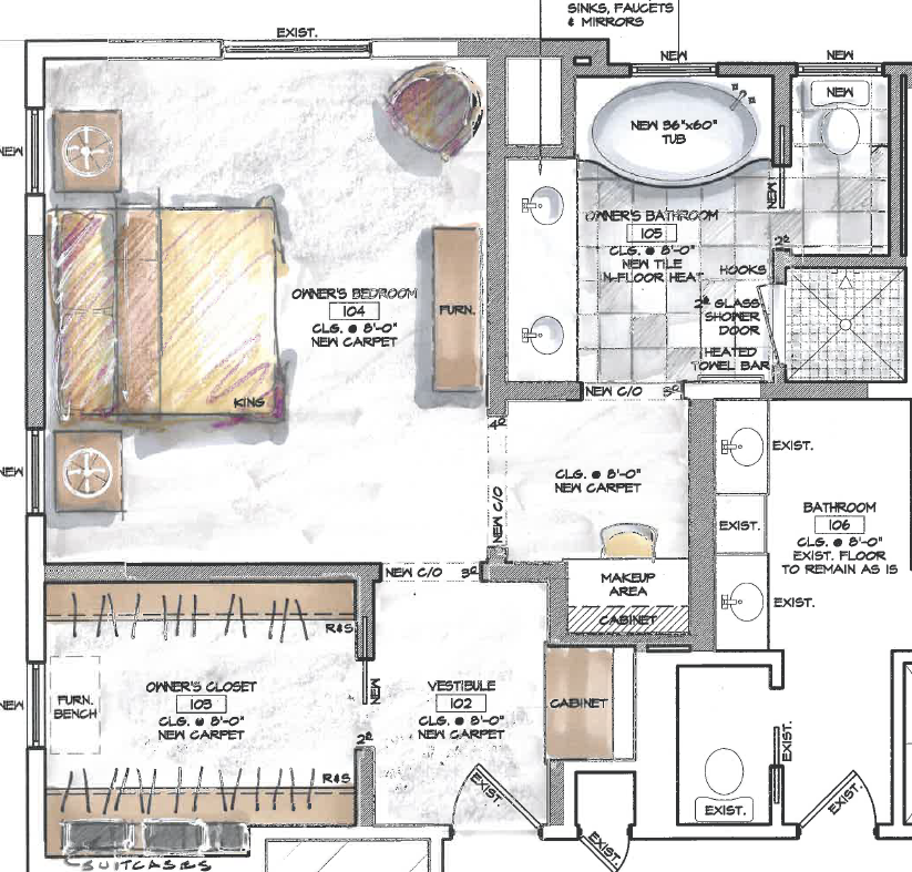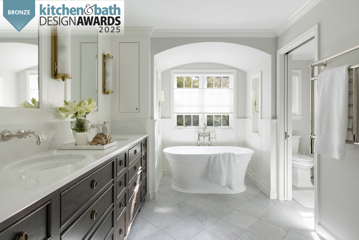 This primary suite, which included the bedroom and bathroom, needed an update that resulted in a more functional, comfortable and personalized retreat with maximum storage. A small addition was added to the bedroom to expand the space and allow for a reading nook with built-in shelving. A wall-integrated linen closet and additional built-in cabinetry near the closet eliminated the need for a dresser and made the room feel more spacious.