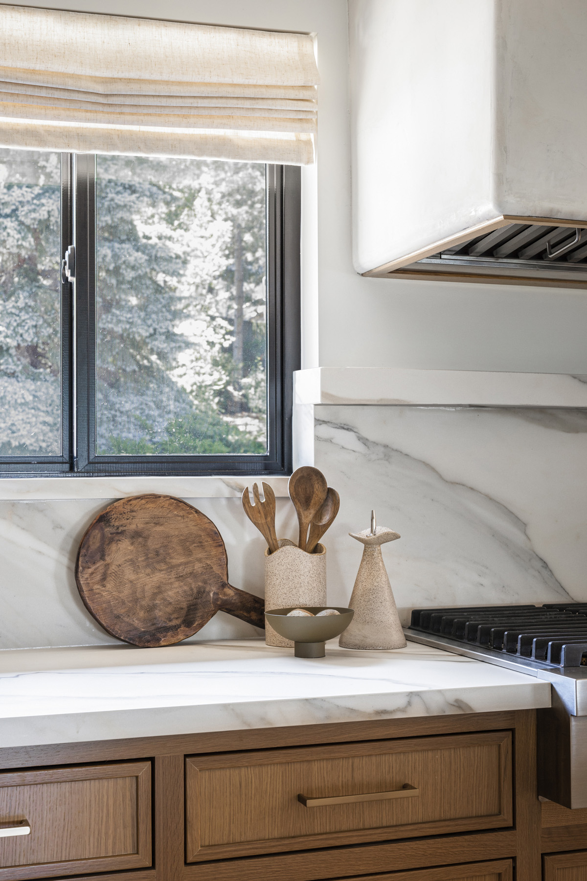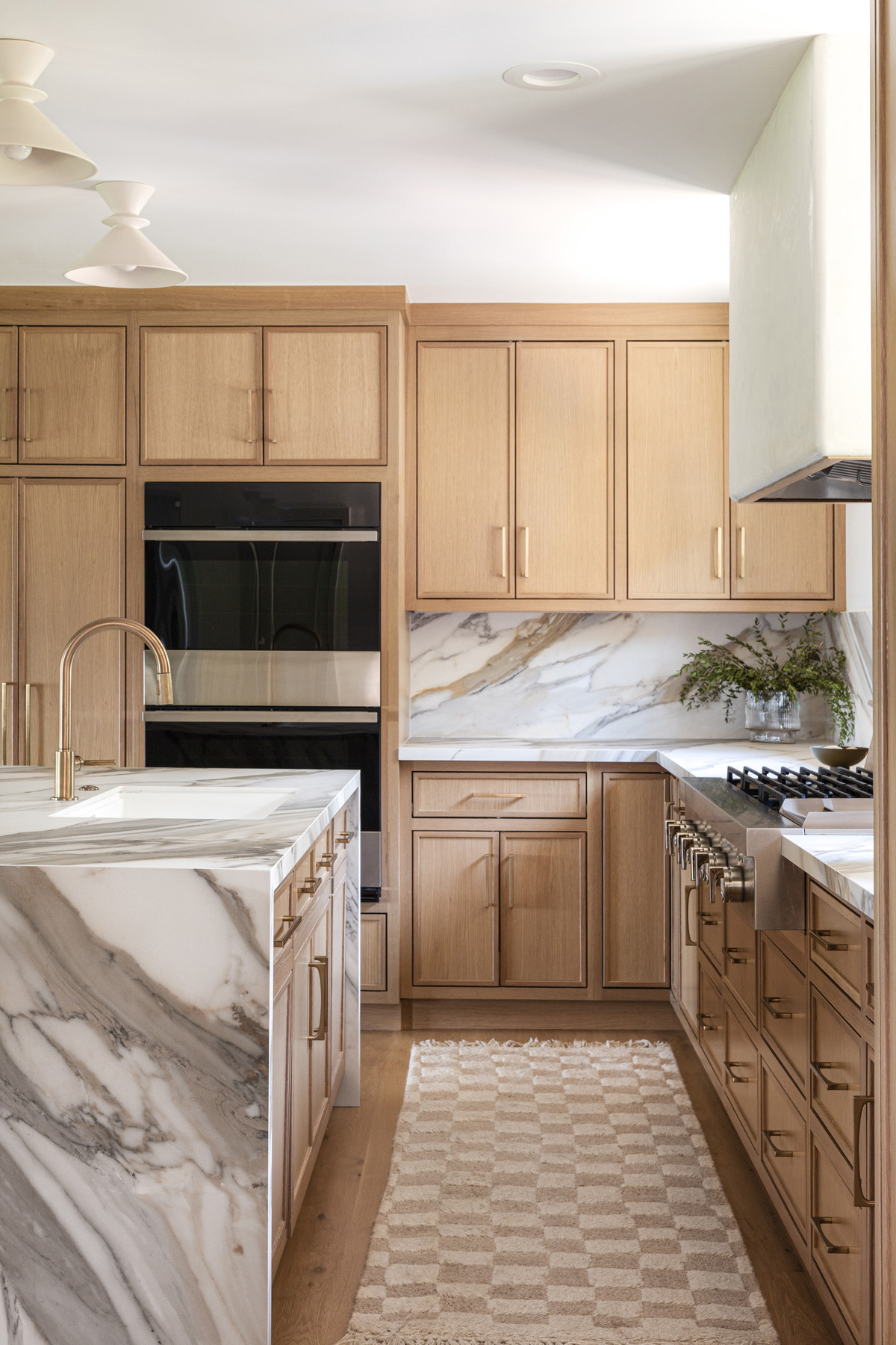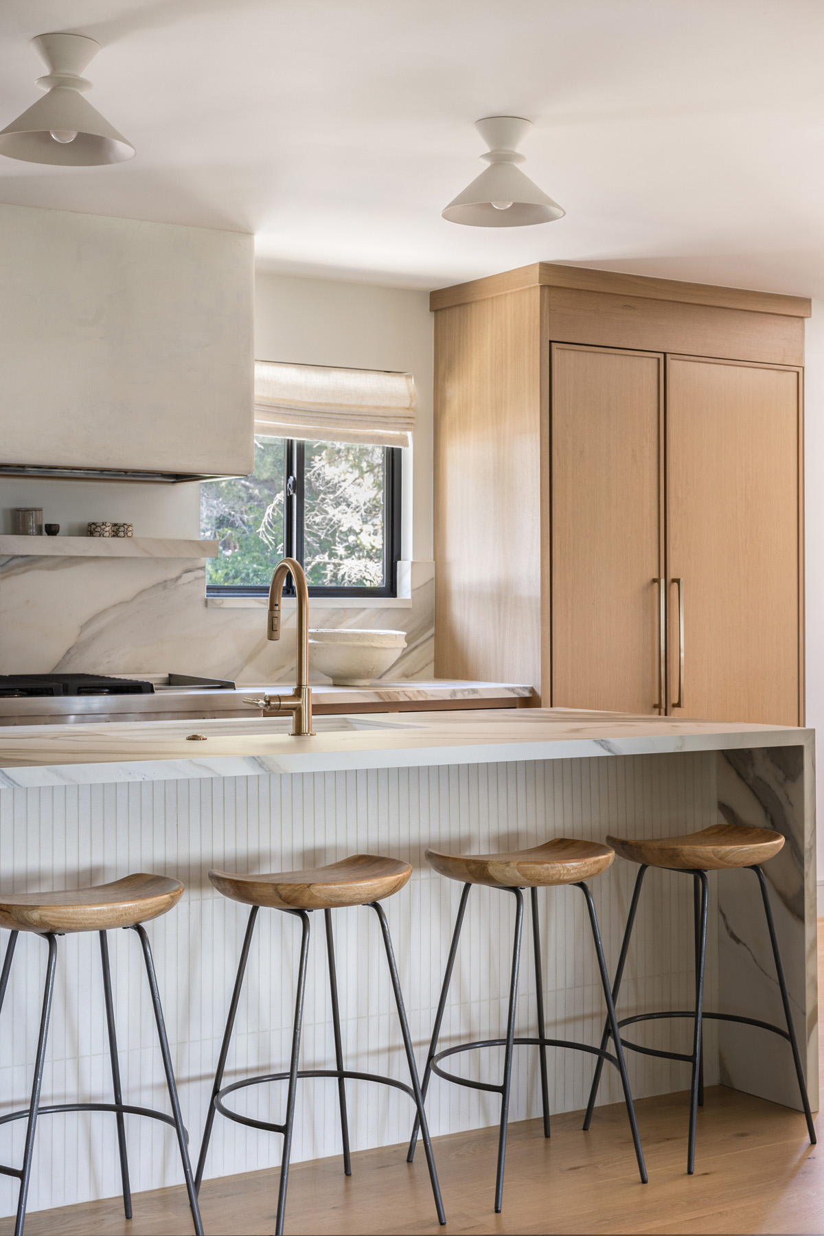 “The finishes we paired with the porcelain tie everything together,” Walsh relates. “For instance, the white oak cabinetry complements the warm veining in the countertop and backsplash while the hardware and ventilation hood surround, which is deliberately simple, contribute to the refined, modern feel. The hood is a key component in the kitchen’s fresh aesthetic where its plaster finish allows a moment for your eyes to rest. Extending it to the ceiling also creates a sense of balance across the visual planes so that no one element overpowers another.”
