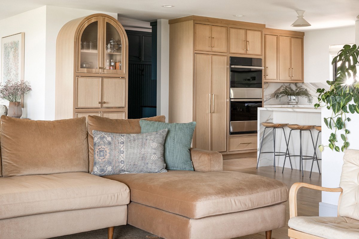 The homeowners also wanted durable finishes, thus the incorporation of the Bedrosians Magnifica Encore Calacatta Macchia Vecchia porcelain countertops and backsplash. The material’s heavy veining delivers an elevated touch, which the designers contrasted with a honed finish that creates a more casual, lived-in aesthetic that resonates with the home’s mid-century design principles.