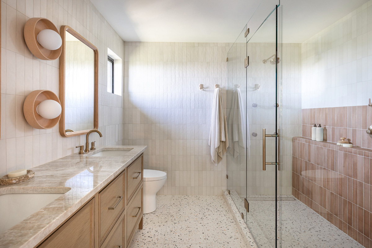 Moving the closet to the bedroom gave the designers space for a much larger shower, which is clad with Bedrosians’ Makoto matte ceramic tile in a mix of Umi Terracotta and Shoji White, the latter of which extends to the walls beyond the shower. Tilebar’s True Terrazzo Sonora Beige tile on the floor gives a nod to the home’s mid-century roots.