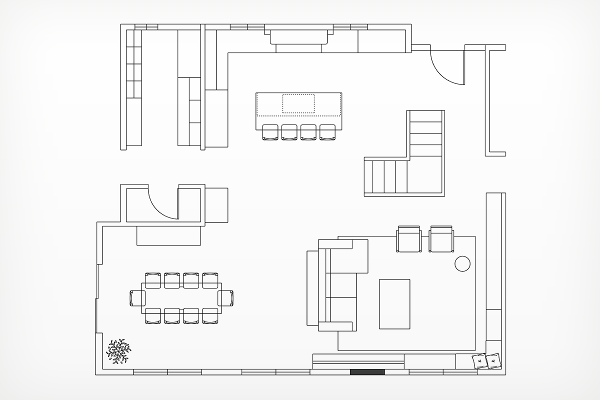 To start, they entirely reworked the layout, enlarging the kitchen by extending it into the previous eat-in area. They also eliminated a pantry and opened up the adjacent staircase and living and dining rooms.