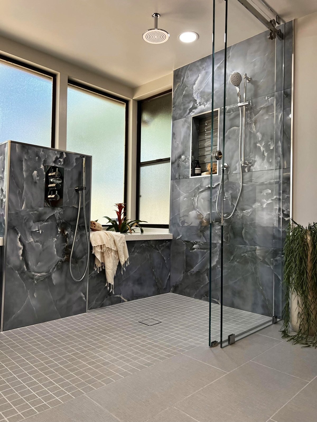 Although the beautiful terrarium was left as is, the tub and deck had to go. By lowering the subfloor several inches, the Anderson Reconstruction team was able to create a walk/roll-in shower. The shower valve and handheld were relocated to a feature tower, making them easy to reach from a sitting position, and new backing and support systems enabled the custom shower door to be ceiling-mounted for a truly curbless entry. The vanity was reduced in size, enabling easy movement with mobility devices. A ledge along the terrarium wall provides seating for the clients and caregivers.