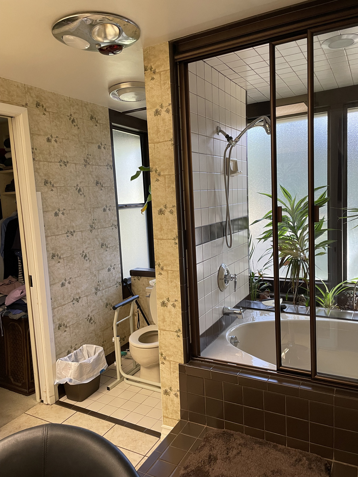 The shower and bath area, located in front of the terrarium, simply was not suitable for a person with limited mobility; climbing in and out was no longer doable or safe for the client. Additionally, the sheer size of the tub, combined with the wraparound vanity, relegated the toilet area to a small nook between the shower and wall, making it difficult to maneuver a mobility aid into position.
