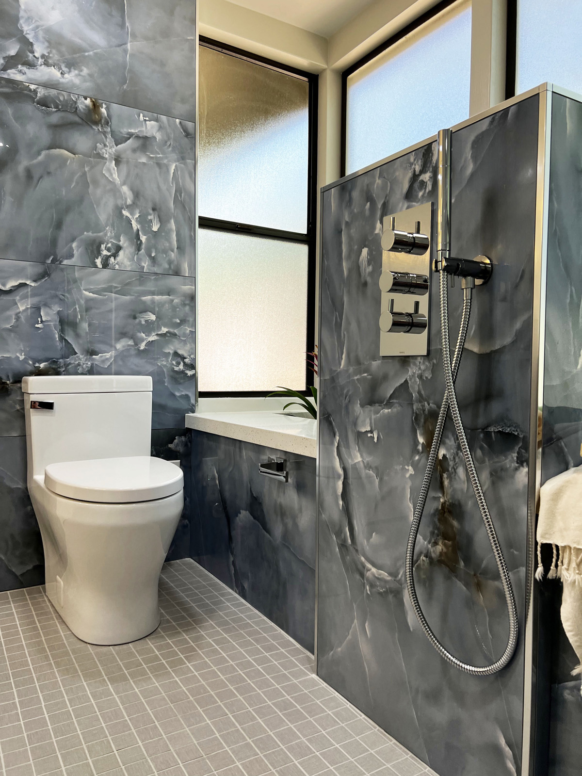 The shower area features sleek Isenberg fixtures and 2″x2″ porcelain floor tile by Arizona Tile. Between the greenery of the terrarium and the large-format porcelain wall tile in the wet room, the new space is both accessible and eye-catching.