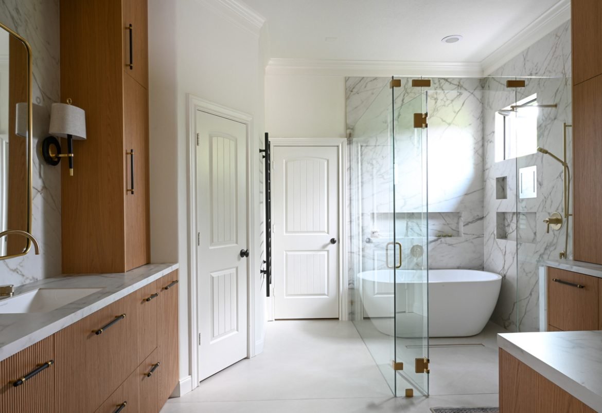 Part of a whole-home renovation, the remodel of the master bath was planned with an eye toward enhanced functionality and updated style, as well as enhanced natural and artificial lighting. Designer Ekaterina Groznaya of Studio E Designs LLC battled supply chain and installation issues to produce a bath the family could be proud of for years to come.