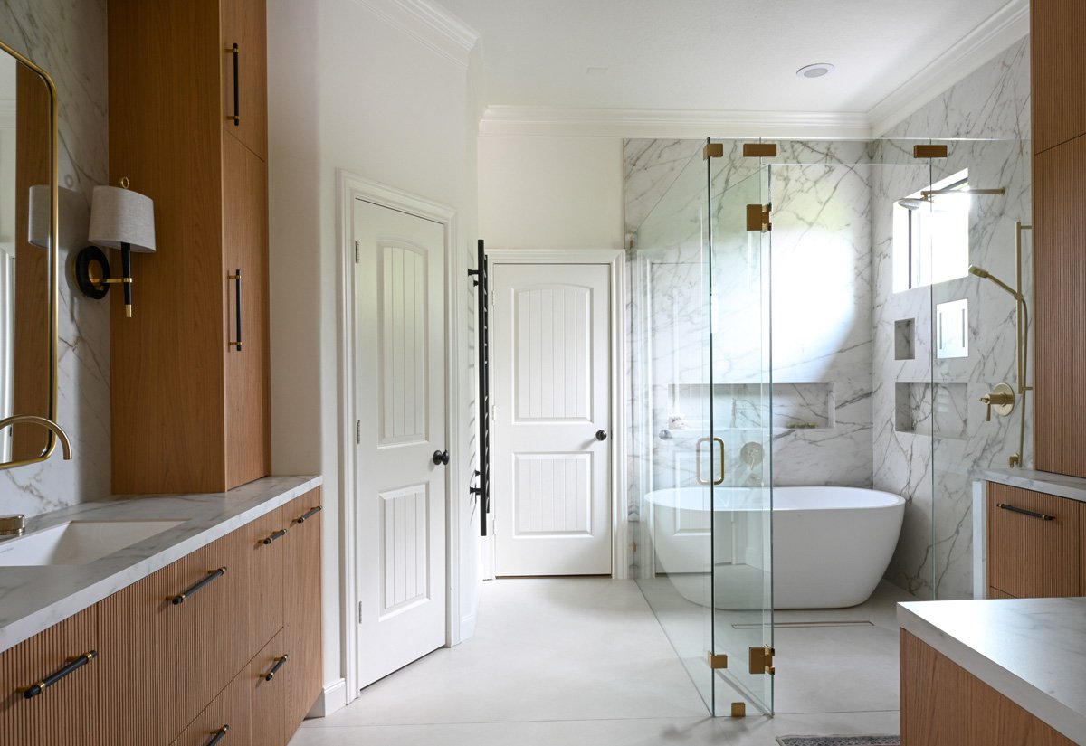 While the jetted tub did not see much use, the clients still wanted a freestanding tub in addition to a large walk-in shower. A large wet room featuring sleek, minimalist fixtures was created, with 12mm porcelain slabs by Daltile sheathing both the walls and floor for a clean aesthetic and easy maintenance. Features including non-slip flooring, grab bars and a curbless walk-in shower ensure the family will be able to enjoy the bathroom at all stages of life.