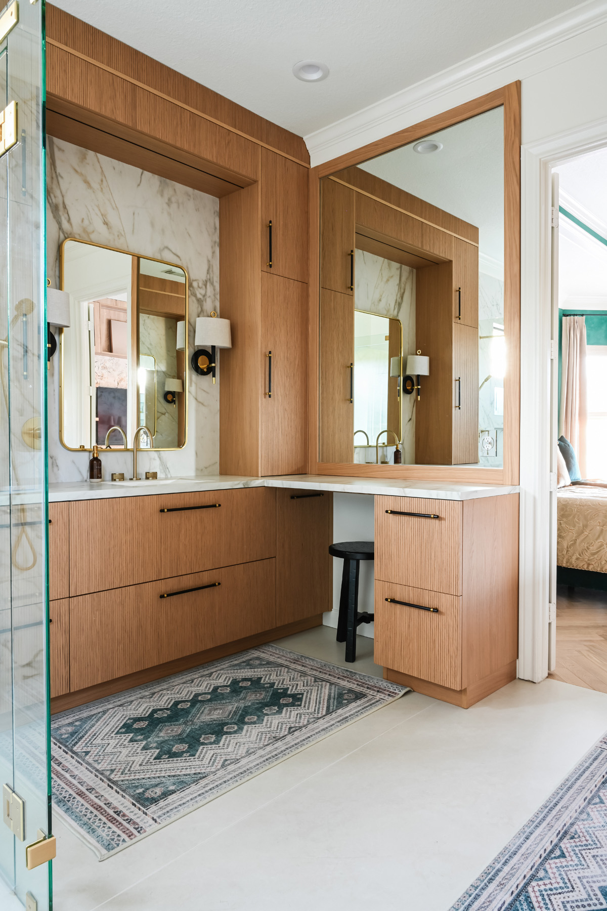 Custom floor-to-ceiling cabinetry from Italy provides plenty of storage, with reeded fronts delivering a distinctive design flourish. For additional functionality, outlets were installed inside the cabinetry.