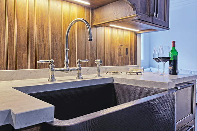 Old World details in the kitchen include a hand-hammered, dark bronze farmhouse-style undermount sink and a beadboard backsplash. The Satin Nickel faucet finish matches the lighting fixtures and cabinetry hardware and the sintered stone countertop resembles concrete and offers resistance to scratching and abrasions.The designers supported the cabinetry with additional Old World details including the hand-hammered, dark bronze Linkasink farmhouse-style undermount sink that is accented with a Franke bridge faucet in Satin Nickel.