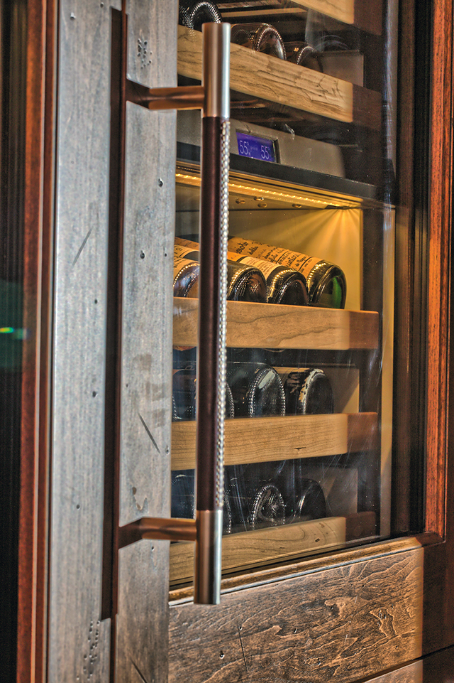 In the tasting room, walnut cabinets were meticulously crafted to seamlessly house the wine refrigeration system and related wine accessories. Accenting the cabinets in the wine tasting room and kitchen with bespoke leather-wrapped satin nickel hardware emphasizes the Old World style and epitomizes its union with a modern design theme.Accenting the cabinets with bespoke leather-wrapped satin nickel hardware from Turnstyle Designs emphasizes the Old World style and epitomizes its union with a modern design theme, which was a goal for the space.