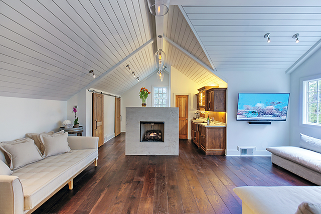 Classic wide-plank European oak flooring from Real Wood Floor’s Railyard Vintage Loft Collection runs throughout the kitchen and anchors the room with a classic vibe that is neither too Old World nor too contemporary. It extends into the sitting area, which includes plenty of seating, a daybed that can be used for overnight guests, a television and a porcelain-tile clad gas fireplace that loosely separates the two spaces. A palladian window flaunts the loft’s upper-level location and allows an abundance of natural light to stream into the space during the day. At night, LED lights take over illumination.