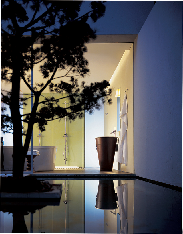 Another area where water features are trending is off the primary bedroom suite. “Many homeowners are looking to create an intimate outdoor space to bring the hotel or spa experience home,” Ferguson’s Bailey observes, particularly in moderate climates. “Outdoor shower panels offer body jets and hand sprays with integrated shelving and come in various styles to complement both the home and outdoor space. Natural materials like treated bamboo, neutral color finishes like white and black powder and stainless steel are popular for both looks and durability.”