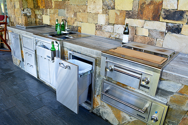 “Materials for outdoor kitchens have greatly expanded beyond the typical stone or brick base,” Kerl points out. “Today we design with wood-look PVC cabinets, stainless steel cabinets and even less conventional materials like porcelain and concrete.” She uses stone, concrete and Dekton for tops.