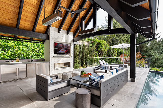 Comfort, lighting and entertainment features are all popular for outdoor living areas, the experts agree. “As noted in the NKBA Design Trends, 48 percent of homeowners are looking for integrated entertainment in their outdoor living spaces. The inclusion of televisions, centralized controls for sound systems and lighting, and smart-home technologies are highly desired,” Zach shares.