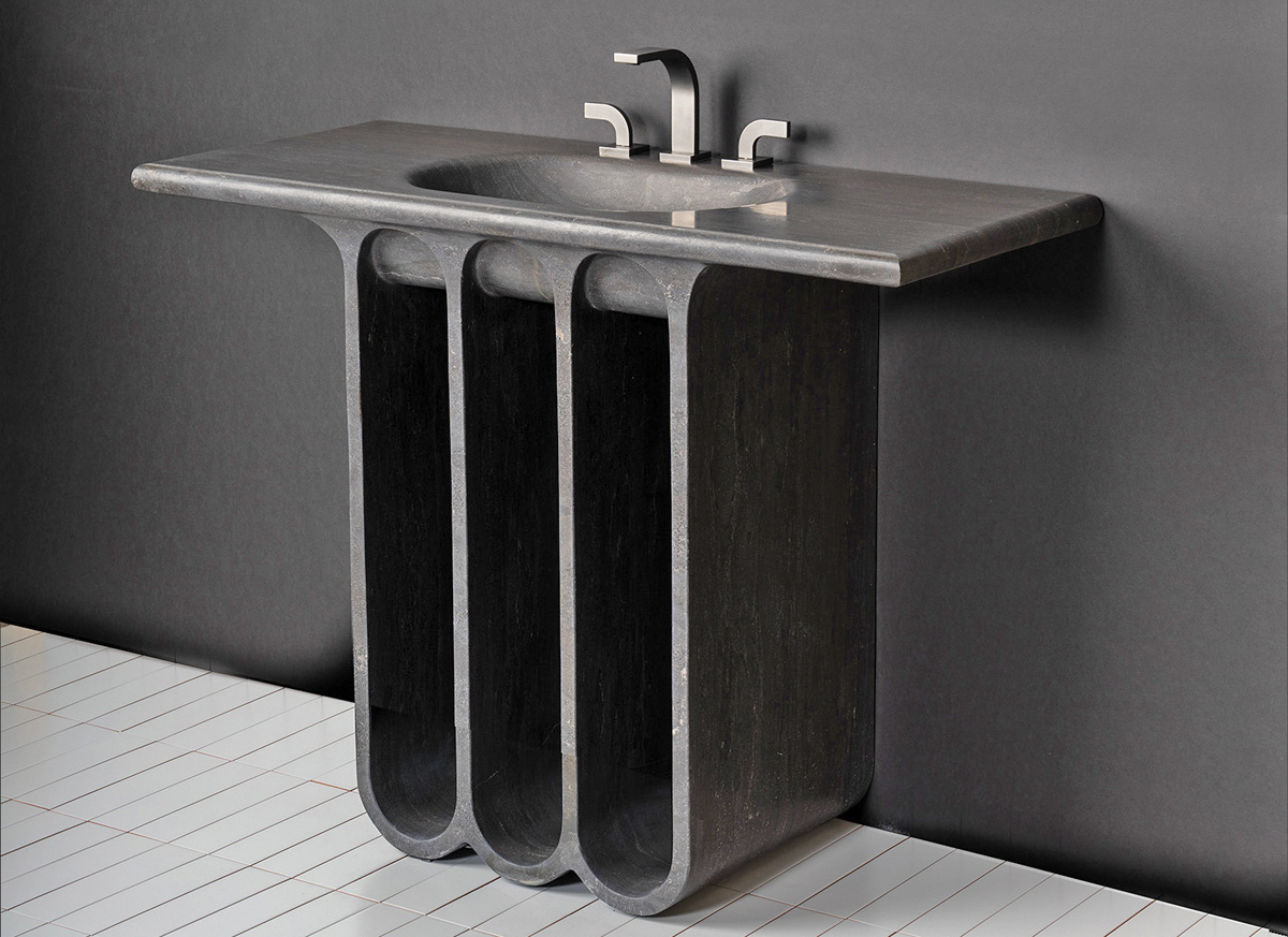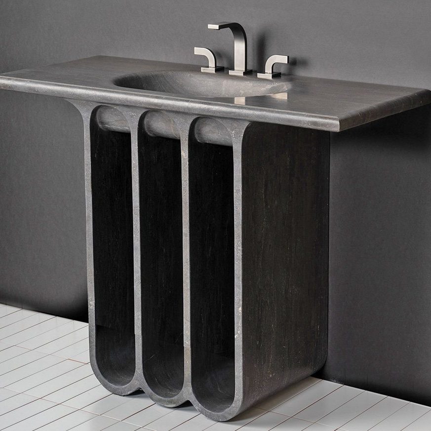 A simple silhouette adorned with clean lines and delicate curvature, the Portico Console Sink is a refined work of precise engineering and sculptural ingenuity that harkens back to mid-century modern design, according to Stone Forest. Carved from a single block of antique gray limestone, the console sink boasts an integrated sink with a generous countertop.