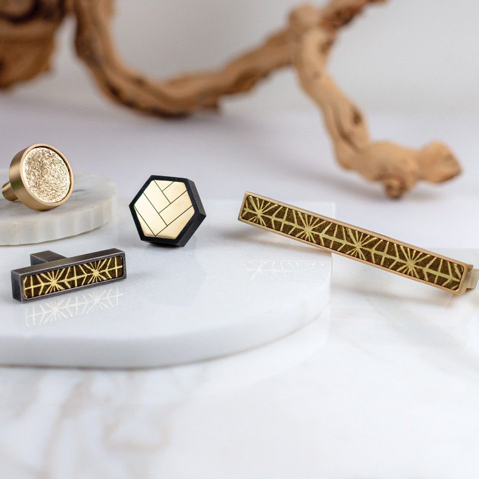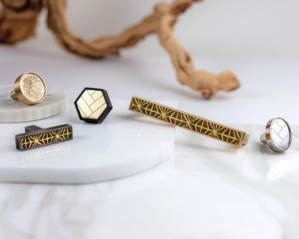 The Thom Filicia for Accurate’s Aurora Collection of cabinet hardware is comprised of five distinctive silhouettes: a rectangular pull, T-bar, round knob, oval knob and hexagonal knob. Each piece showcases laser-etched designs ranging from a pattern to match one of Thom’s wallpapers to a simple herringbone.