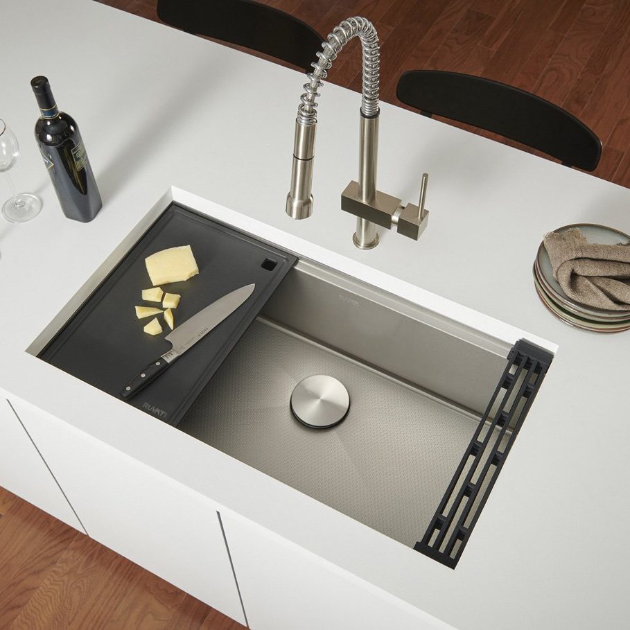The HexBottom kitchen sink collection features an etched geometric design that keeps sinks looking new without grids or sink protectors, according to Ruvati. This patent-pending technology brings an embossed finish to stainless steel sink bottoms with a hexagonal pattern and matte finish for a semi-reflective look. The workstation sink includes a built-in ledge that provides a platform for 40+ LedgeFit accessories.