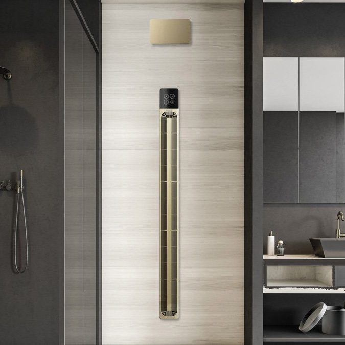 The minimalist single-bar design of Modello i towel warmer from Amba Products has vertical or horizontal installation capabilities, allowing it to be installed in a range of spaces and configurations. It is offered in round or square bar profiles in four lengths and four finishes – Matte Black, Satin Brass, Brushed and Polished Stainless Steel. The dry electrical system provides complete heating throughout the towel bar.