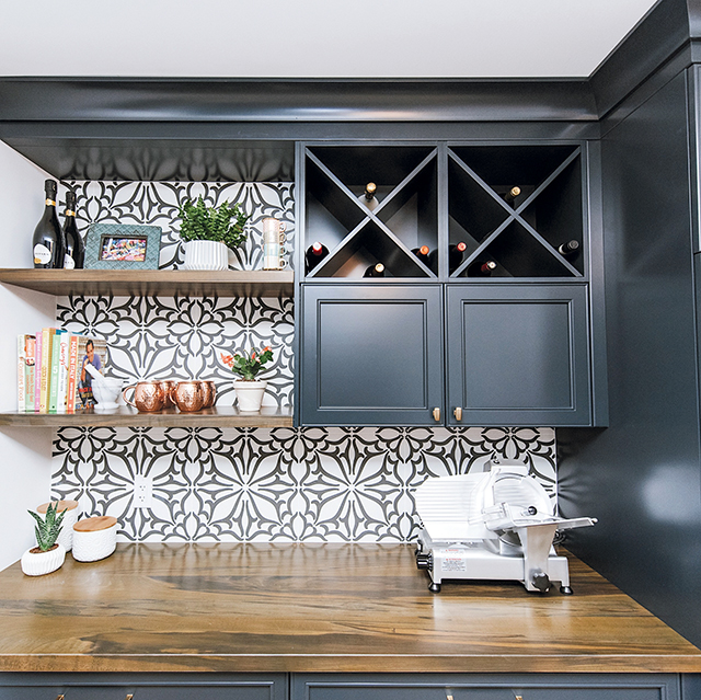 Tuckett jazzed up this walk-in pantry with a custom navy color, paired with a floral patterned tile backsplash and ebonized ambrosia countertops and floating shelves.Photo: Lively Creative Co.