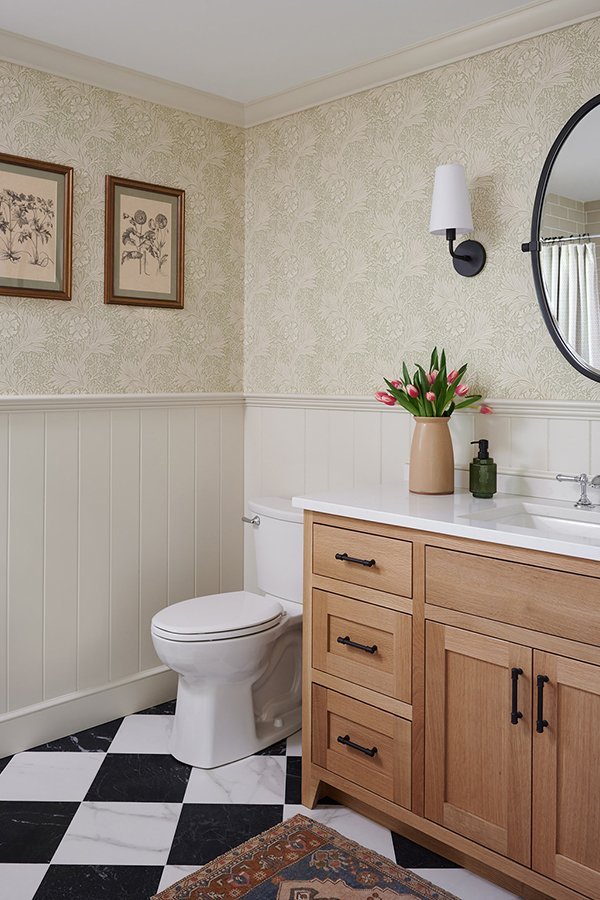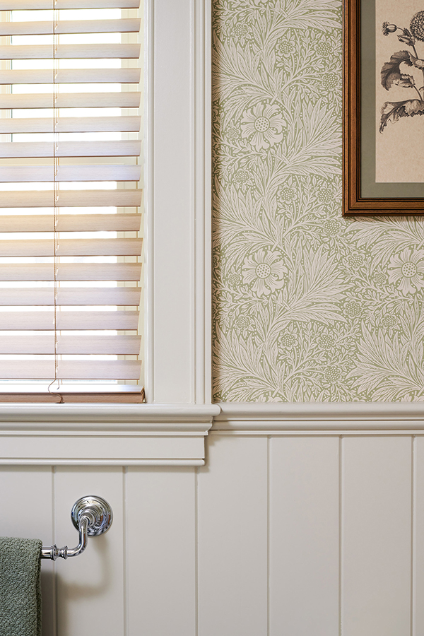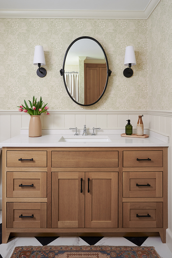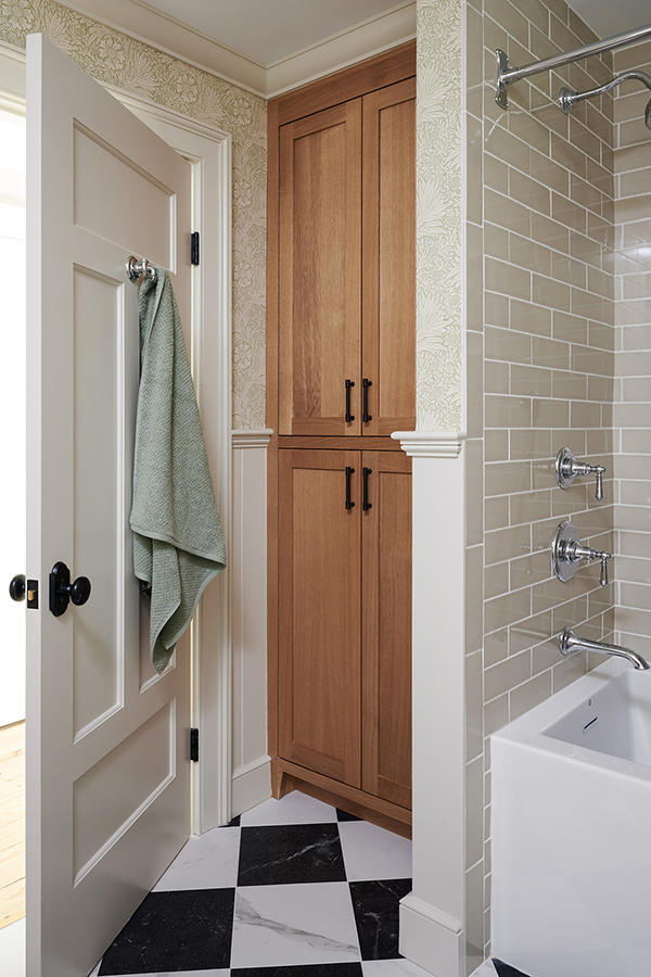 The clients wished to transform an old children’s bathroom into a more comfortable, updated one that could be used by guests. They wanted to gut the entire bathroom, apart from the existing window, and to preserve the layout of the existing plumbing. The designer saw the potential for wallpaper in the new space and suggested a charming green and white floral pattern from 1875, which brought a feeling of elegance to the bathroom. The bathroom has the only tub in the house, so the clients wished to upgrade it from porcelain to hardier MTI. The team installed a statement vanity with quartz countertops and plenty of storage below an oval mirror and additional lighting. A linen closet fits snugly between the shower and the door, making the most out of the bathroom’s space.