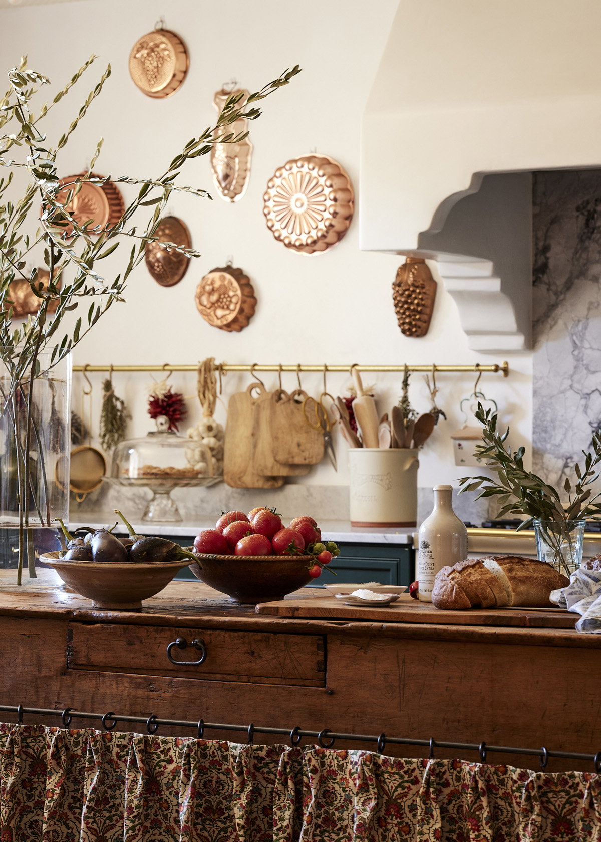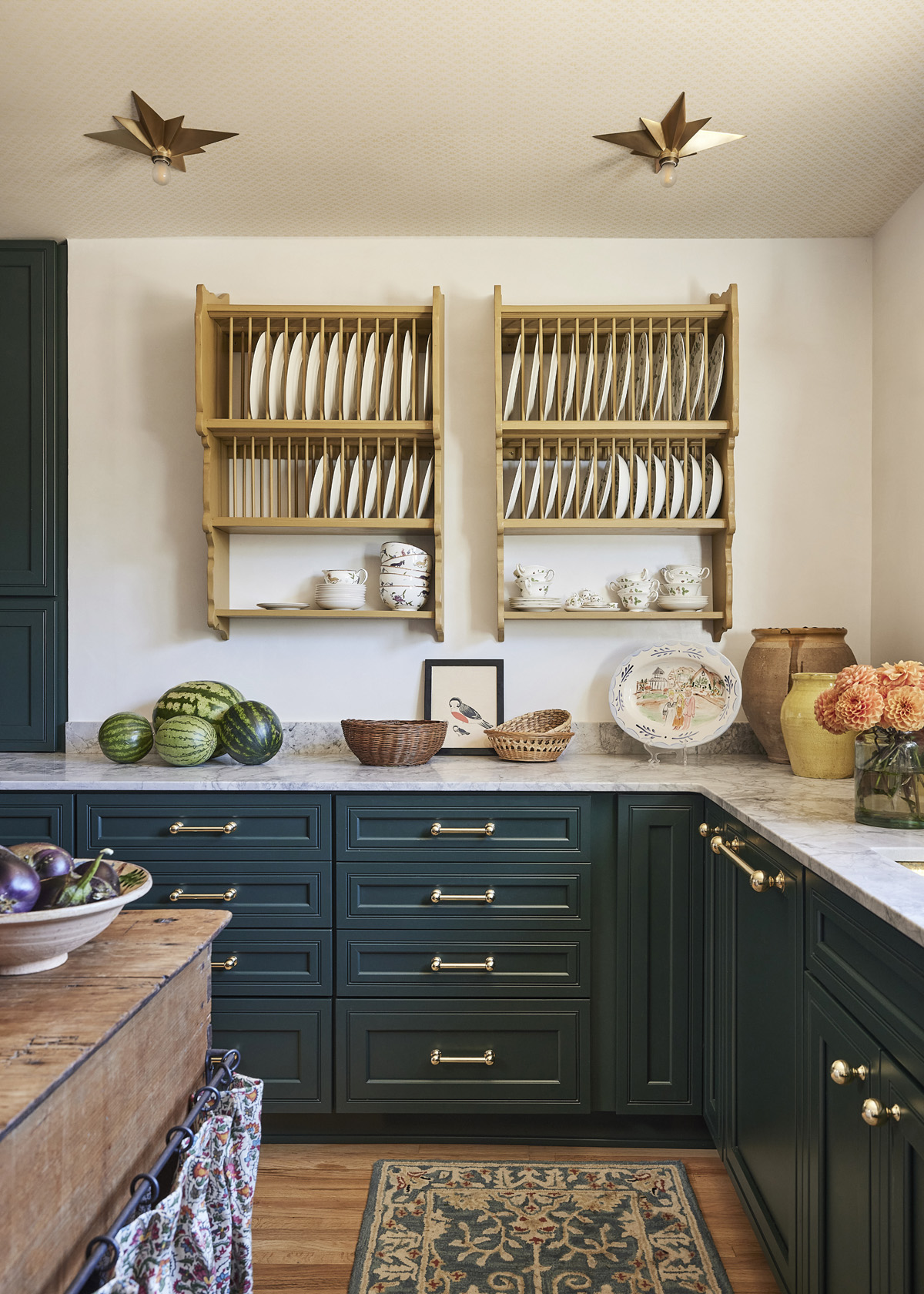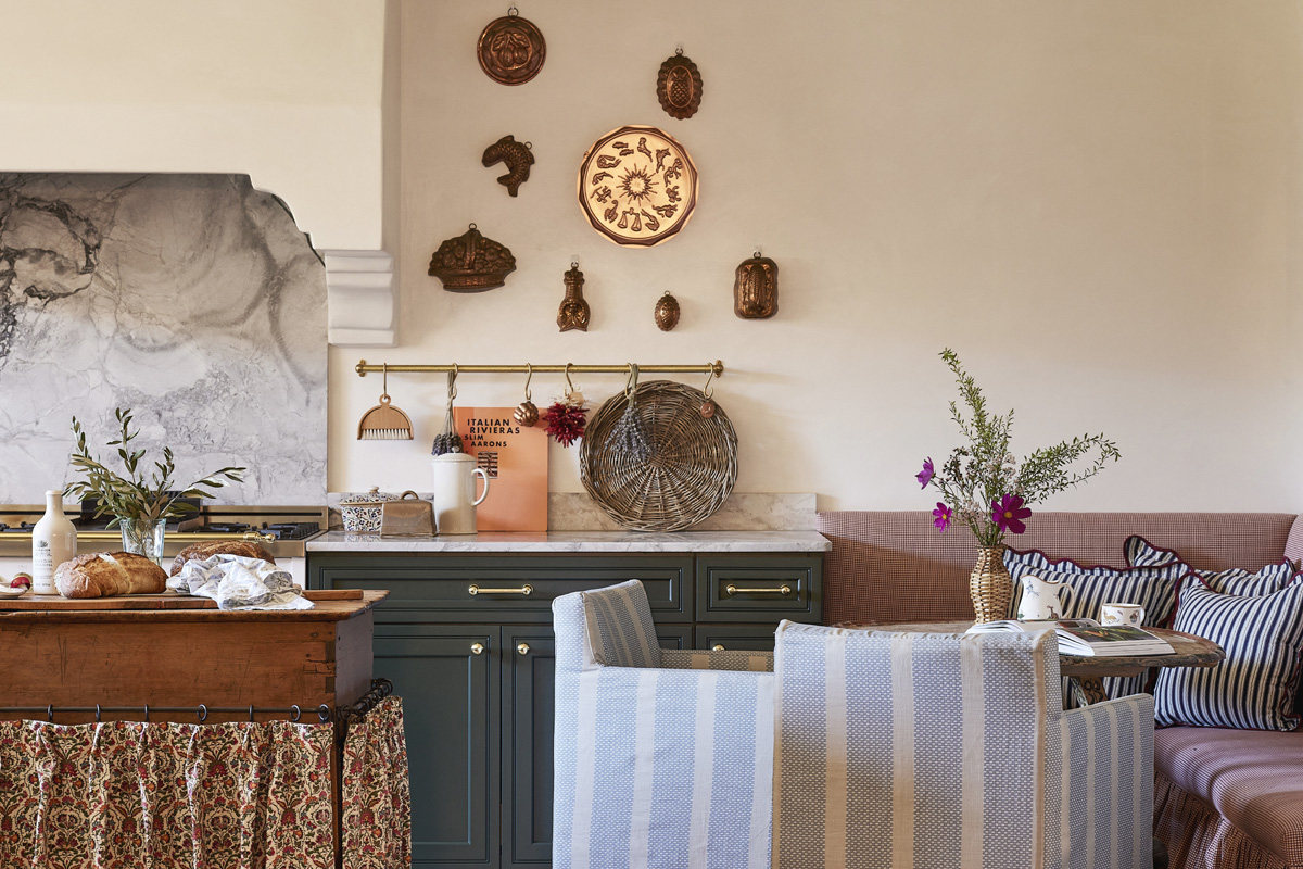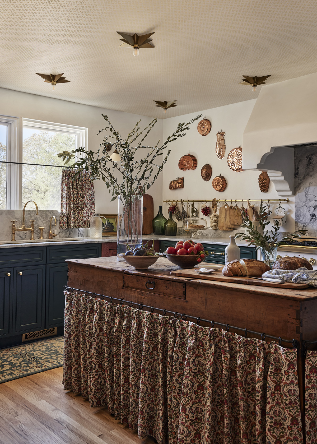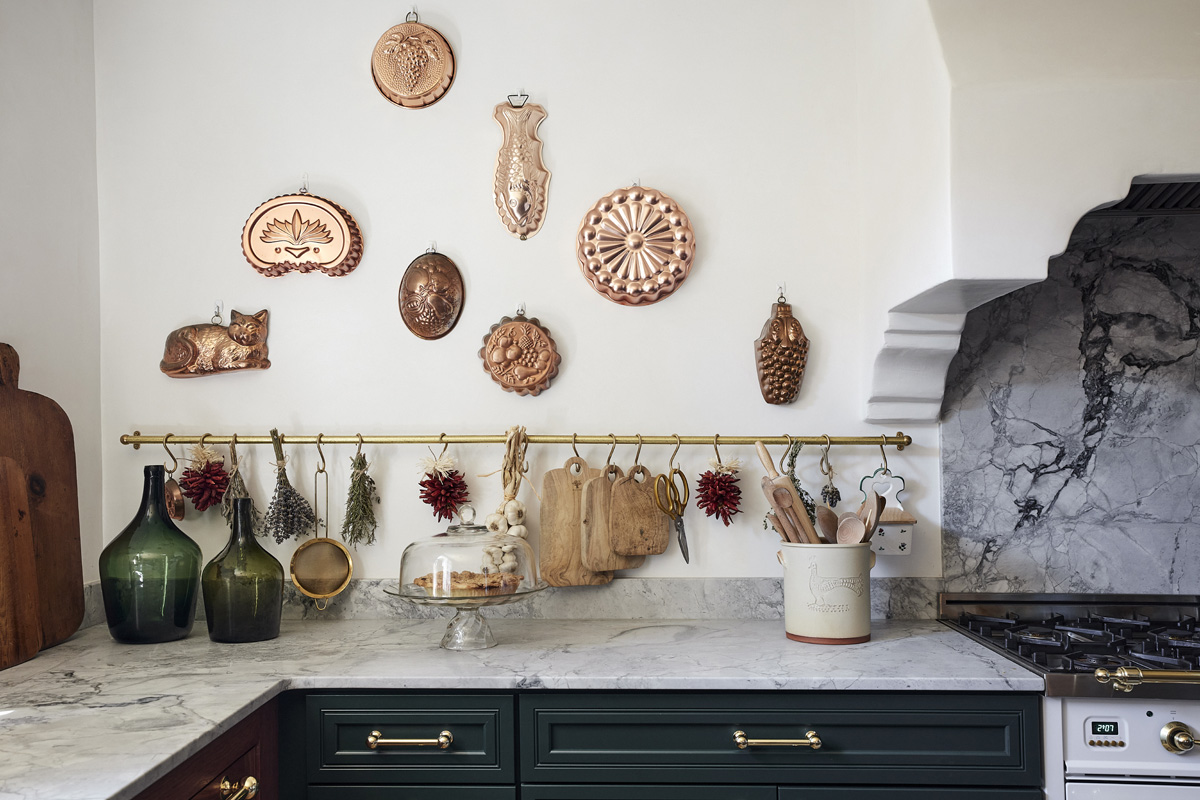 However, smart design and resourceful planning enabled the team to work within the home’s existing footprint to create a design that uses rich materials, color and thoughtfully sourced pieces – such as the Santa Clara Brass brass sink with integrated drainboard, deVol Kitchens Aged Brass Hanging Rail and Modern Matter cabinet hardware – to uphold the character of the home.