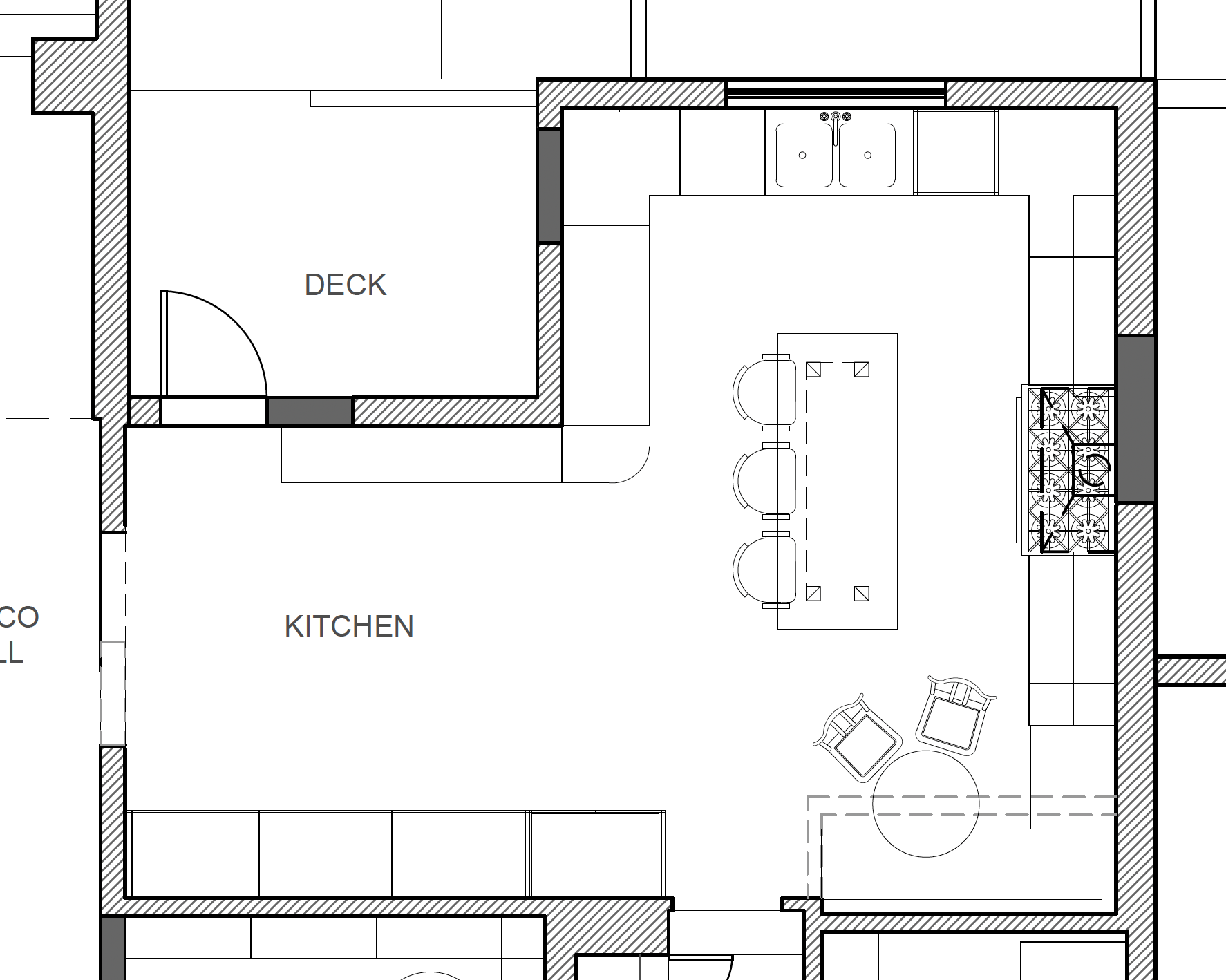 Key goals included modifying the original narrow and poorly configured kitchen to improve flow and functionality, without major structural changes. In that effort, a pocket door helped to open the space. As well, a window was removed and a door was moved and reset. Several appliances were repositioned, which demanded rerouting utilities.