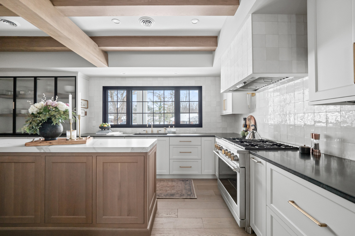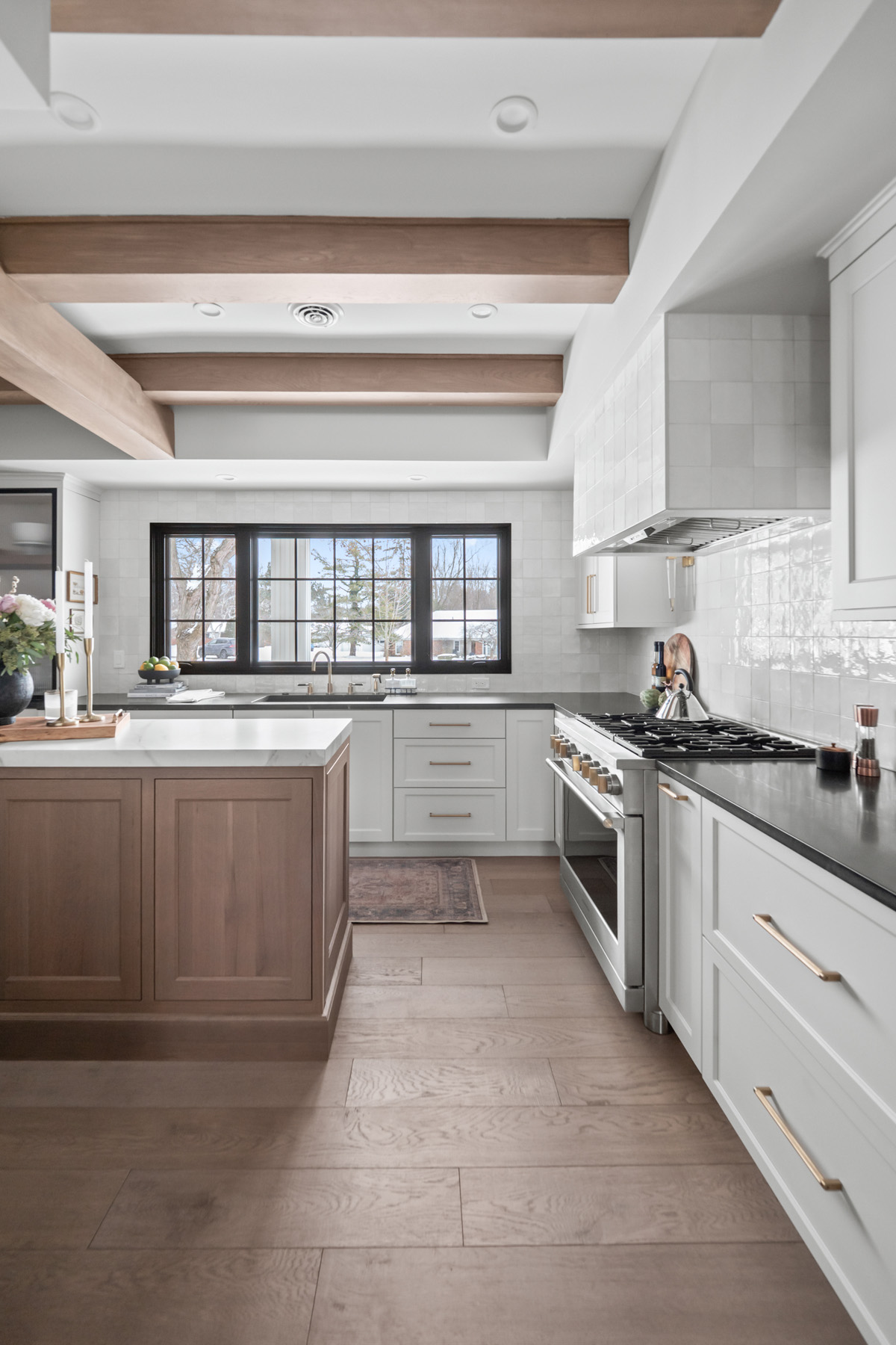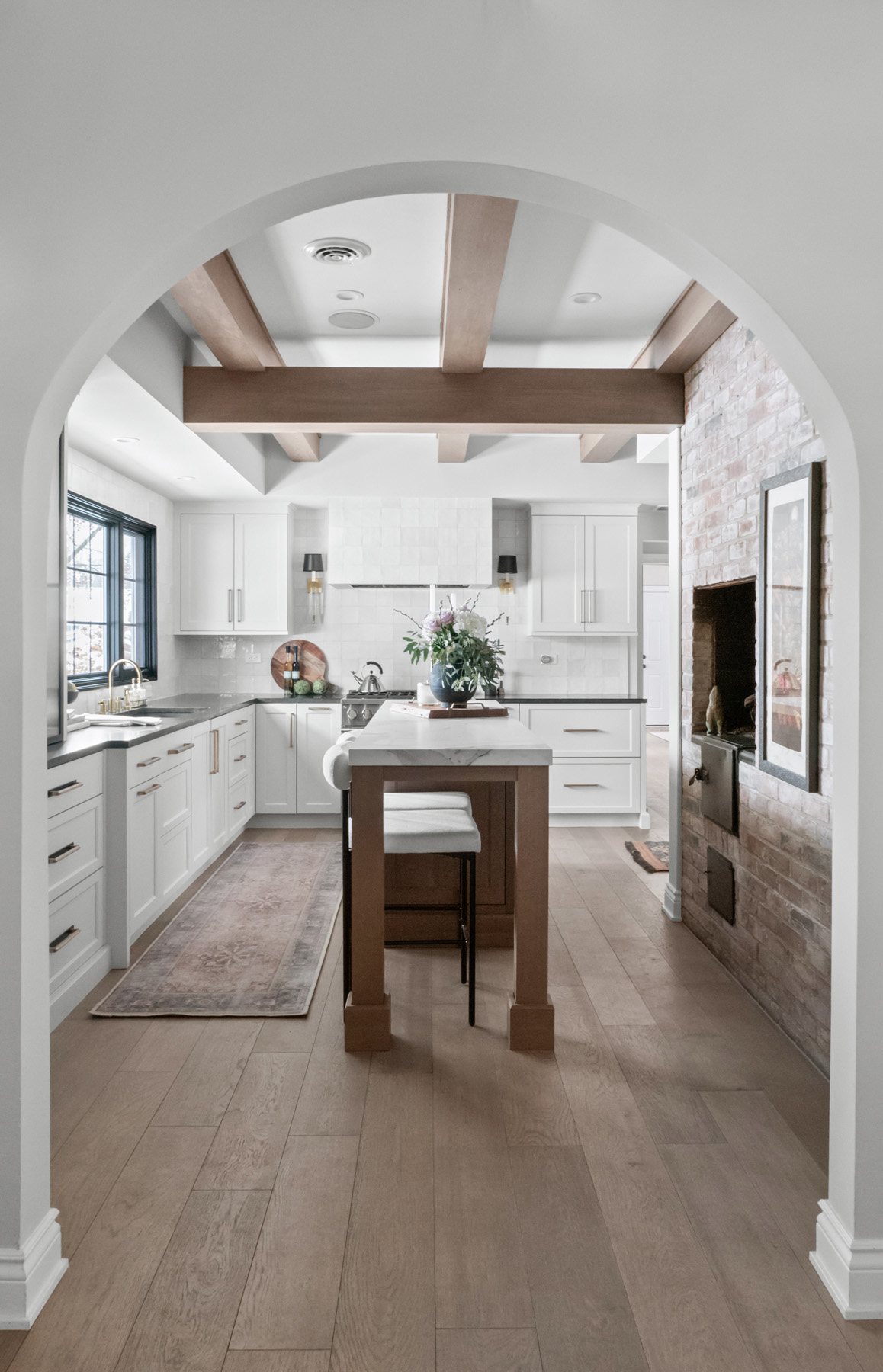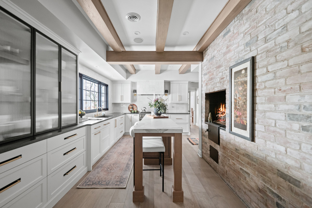 One standout feature of the previous kitchen was a brick wall with a fireplace, which the designer knew she wanted to keep. As a complement, existing ceiling beams were wrapped with natural wood, which adds warmth and continuity to the space. Playing with a mix of black, gold and creamy tones ensures a balance of bold accents and soft neutrals while replacing the original slate floor tiles with large wood planks offers a better connection to the kitchen’s new design vision.