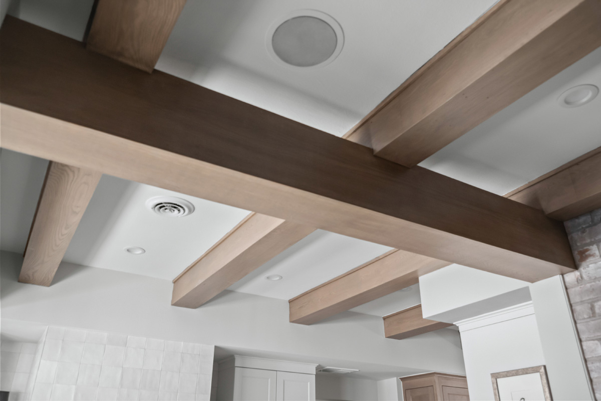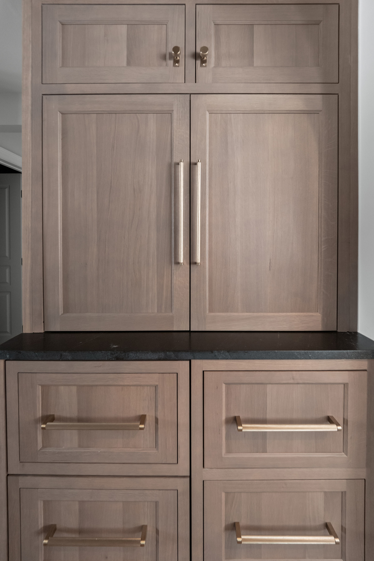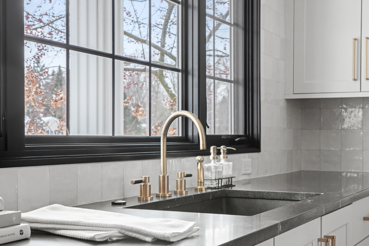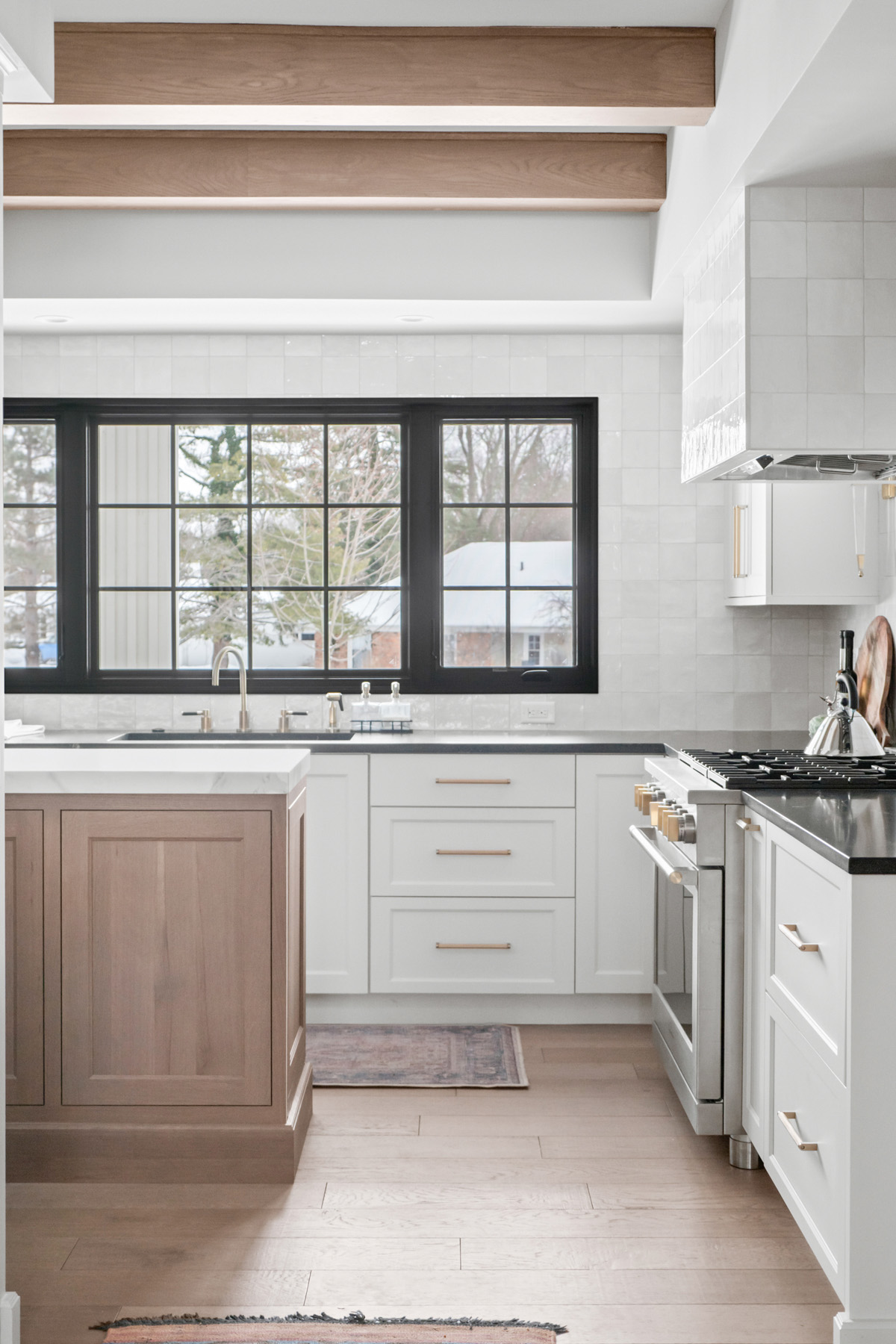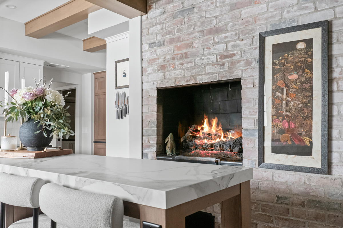 One standout feature of the previous kitchen was a brick wall with a fireplace, which the designer knew she wanted to keep. As a complement, existing ceiling beams were wrapped with natural wood, which adds warmth and continuity to the space. Playing with a mix of black, gold and creamy tones ensures a balance of bold accents and soft neutrals while replacing the original slate floor tiles with large wood planks offers a better connection to the kitchen’s new design vision.