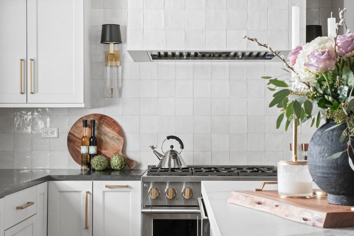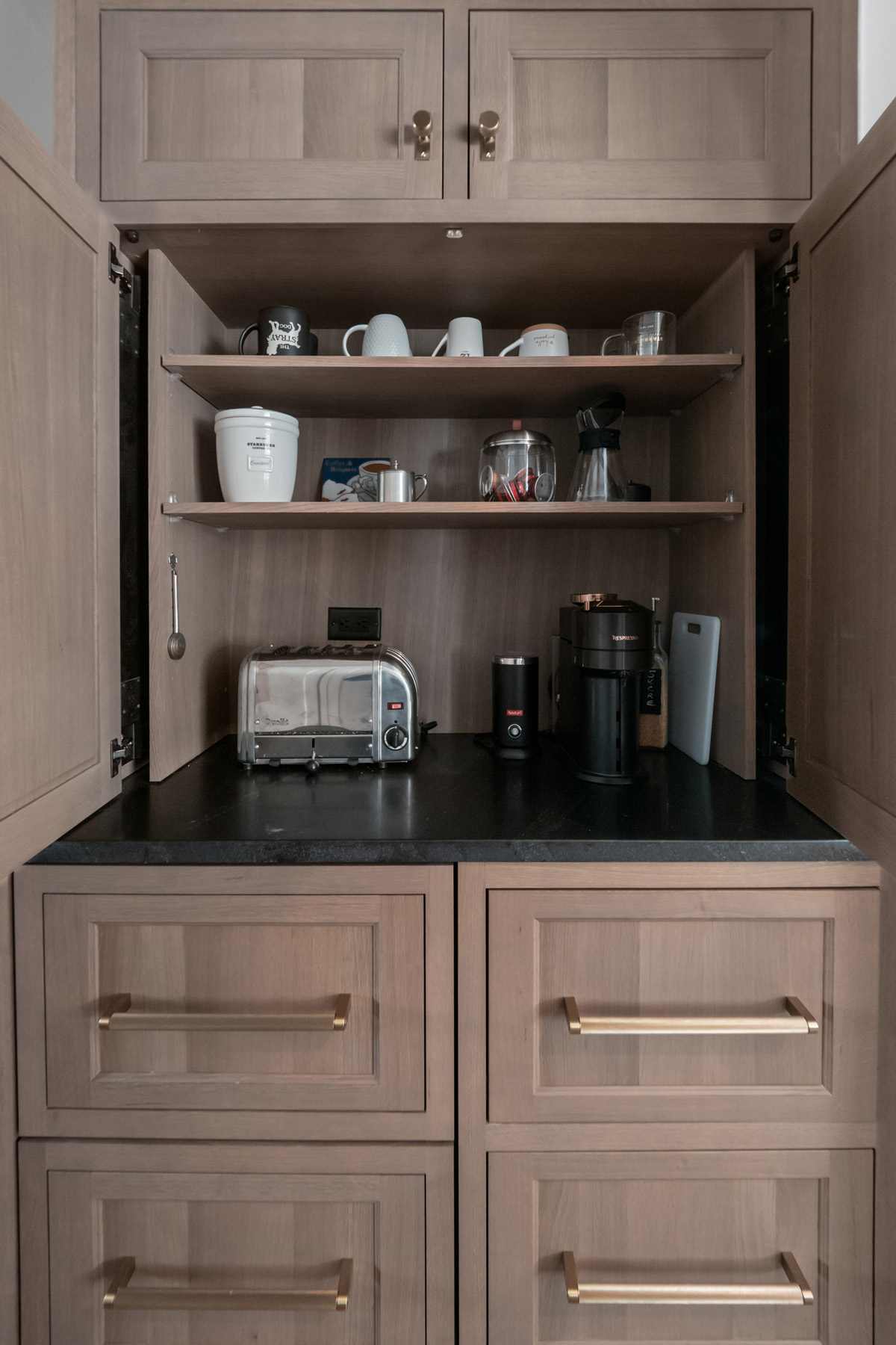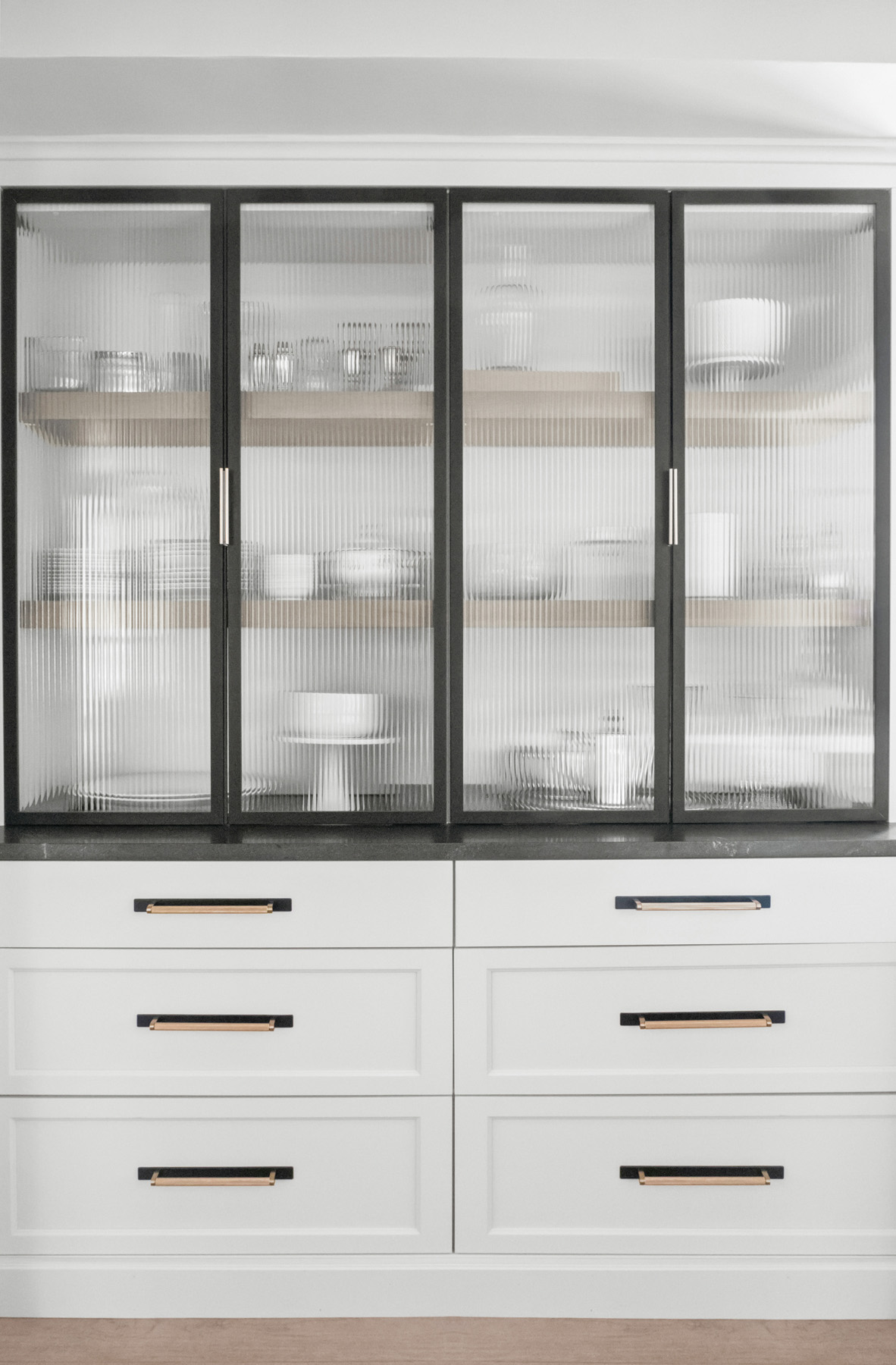 Adjusting the depth of the perimeter Inspira Cabinetry Concordia cabinets made room for a perfectly sized island that provides seating without overwhelming the space, notes the designer. Modifying walls and windows, including removing a small window by the buffet that allows the inclusion of statement cabinetry, lets more natural light flow into the space. Incorporating glass doors into the buffet gives it a China cabinet-inspired look.