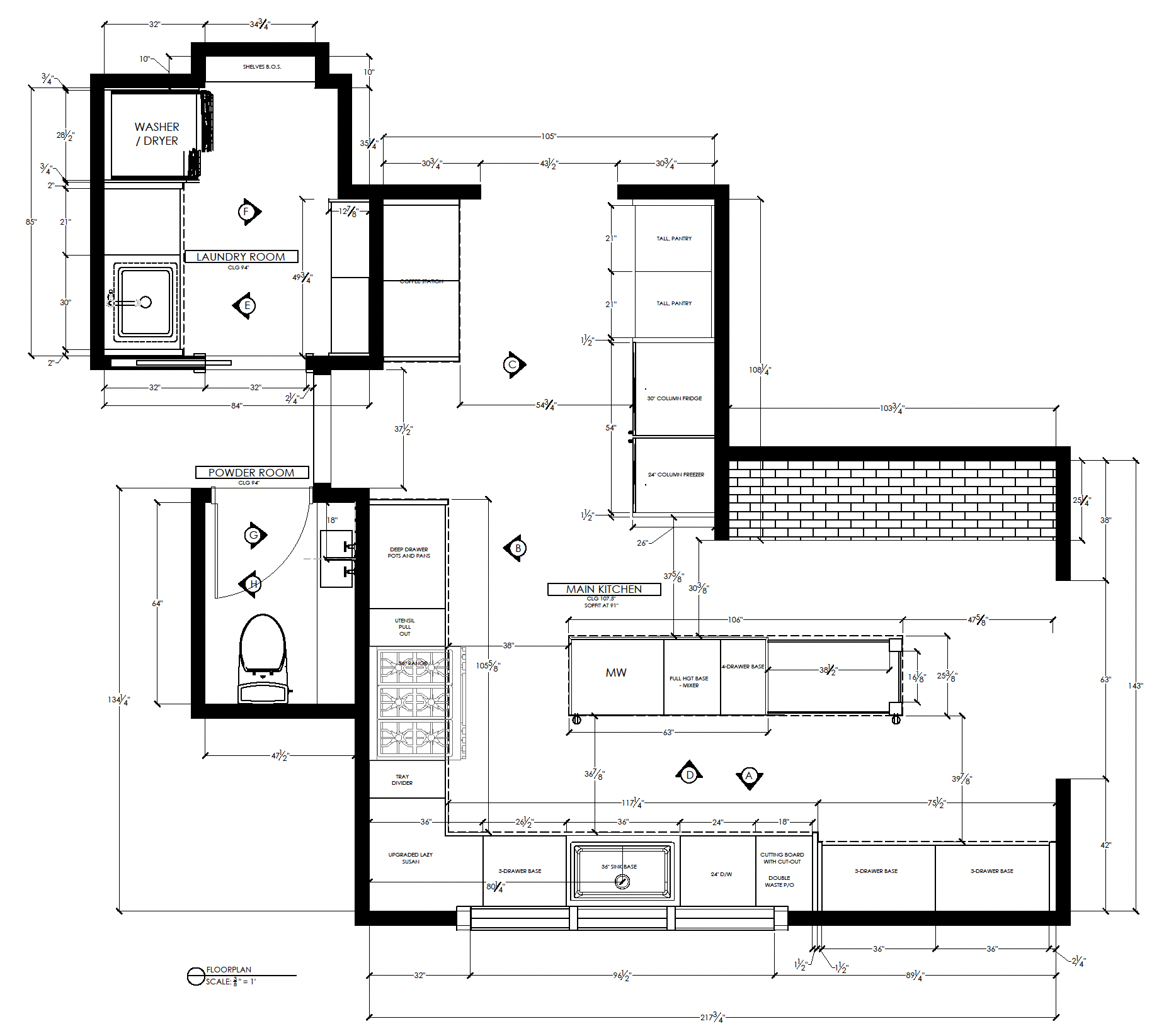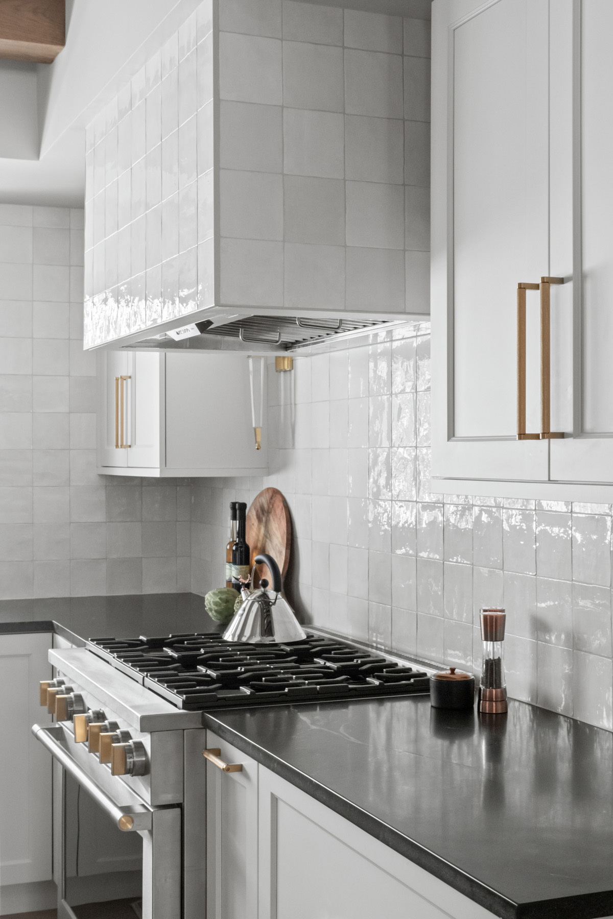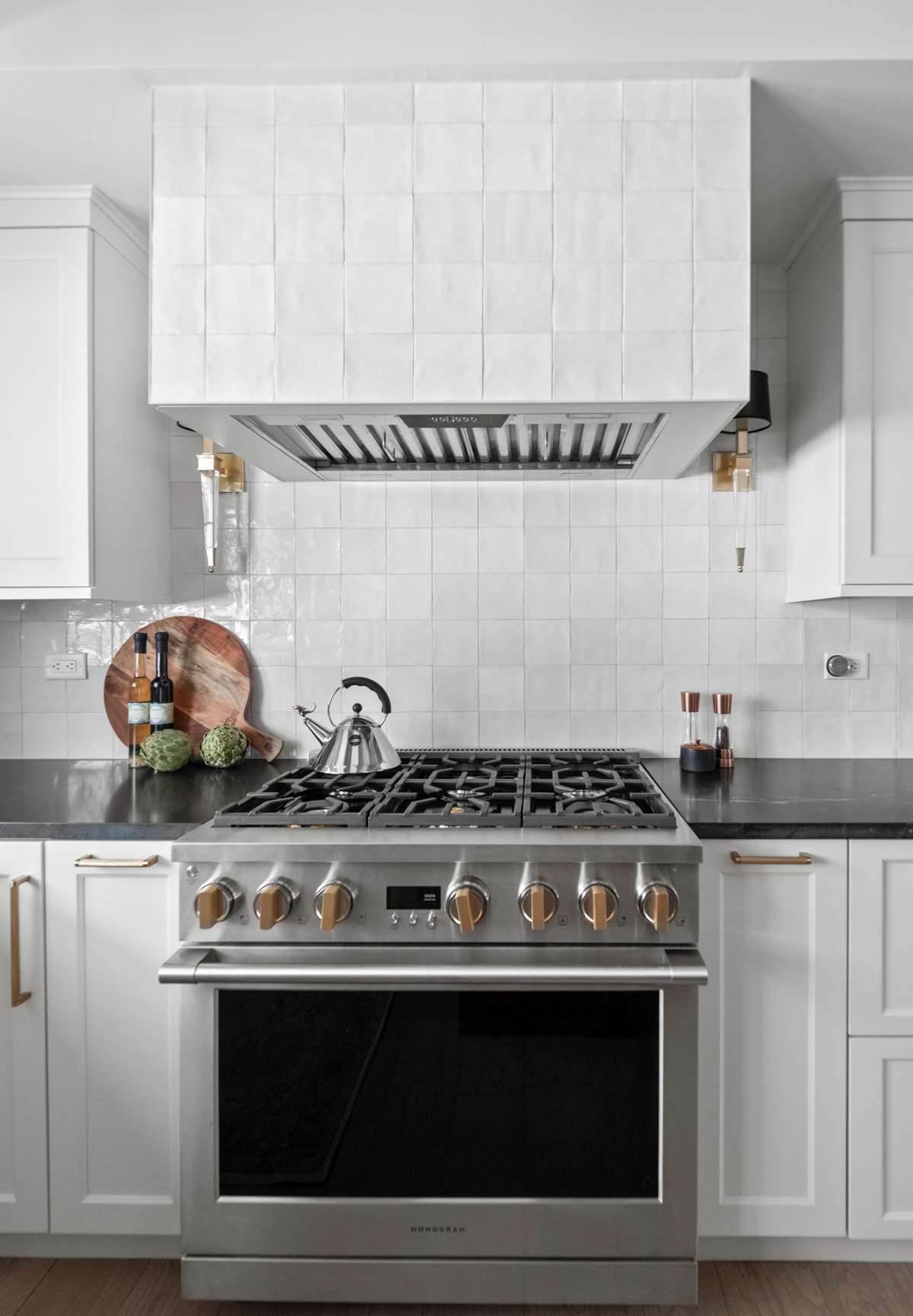 Along the perimeter, a Blanco PRECIS low-divide Silgranit sink is paired with a Moen Align pull-down faucet below the sink, with Bosch dishwasher close at hand. A 36″ Dual-Fuel Professional Range from Monogram is topped with a custom range hood with Zephyr liner. Flash Series ceramic wall tile from Arizona Tile covers the walls, adding light and shine. A Monogram refrigerator and freezer, as well as Presrv refrigerator drawers from Zephyr and GE Profile microwave oven are also featured.