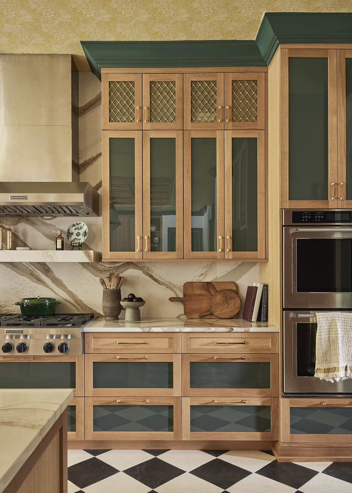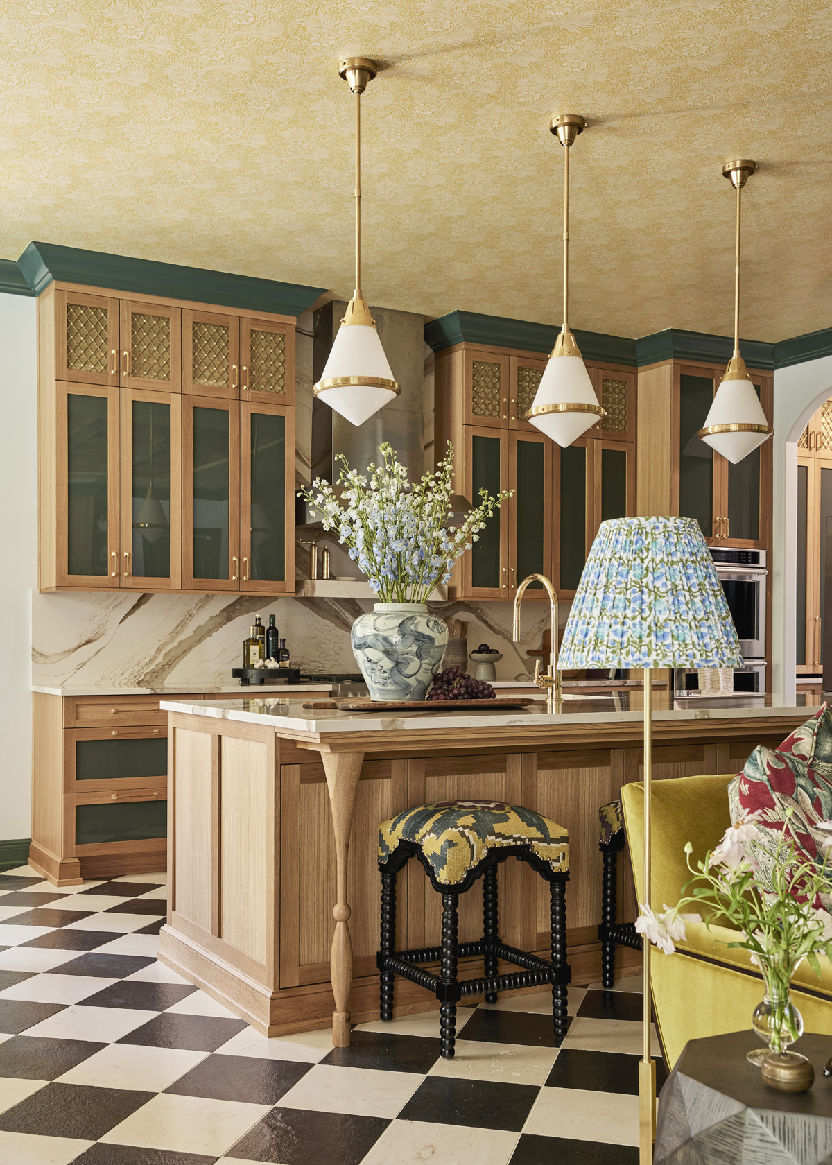 For example, Cambria’s Brittanicca Gold Warm quartz tops the base cabinetry on the island and perimeter and serves as the backsplash. The white oak island apron is custom fabricated by Boyd & Allister, a custom furniture studio in Santa Fe. The wall and base cabinets are accented with House of Antique Hardware Unlacquered Brass cabinet pulls in an Arts and Crafts design. The latter’s gold tone matches the Waterworks Brass Henry kitchen faucet and Visual Comfort hand-rubbed Antique Brass Gale pendants above the island.