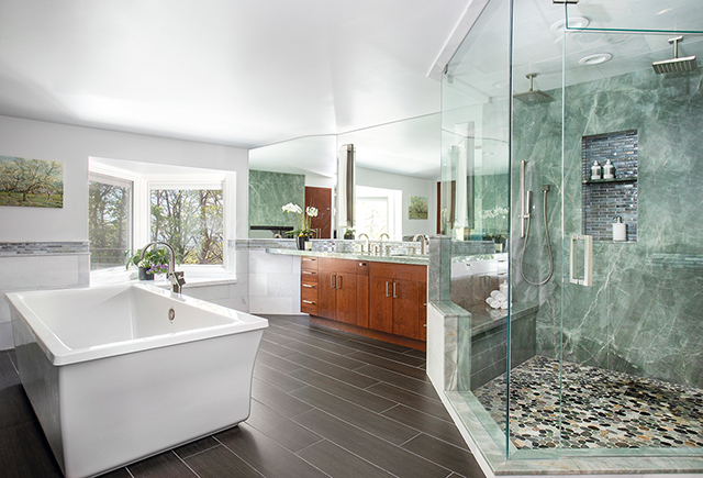 This bath features a large shower with two rain showerheads and hand-held shower, in a natural aqua quartzite stone and sliced stone pebble shower floor. A freestanding tub placed in front of a see-through fireplace creates a peaceful space.Education and elevation