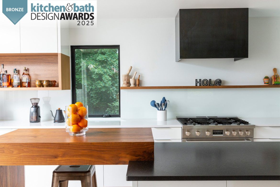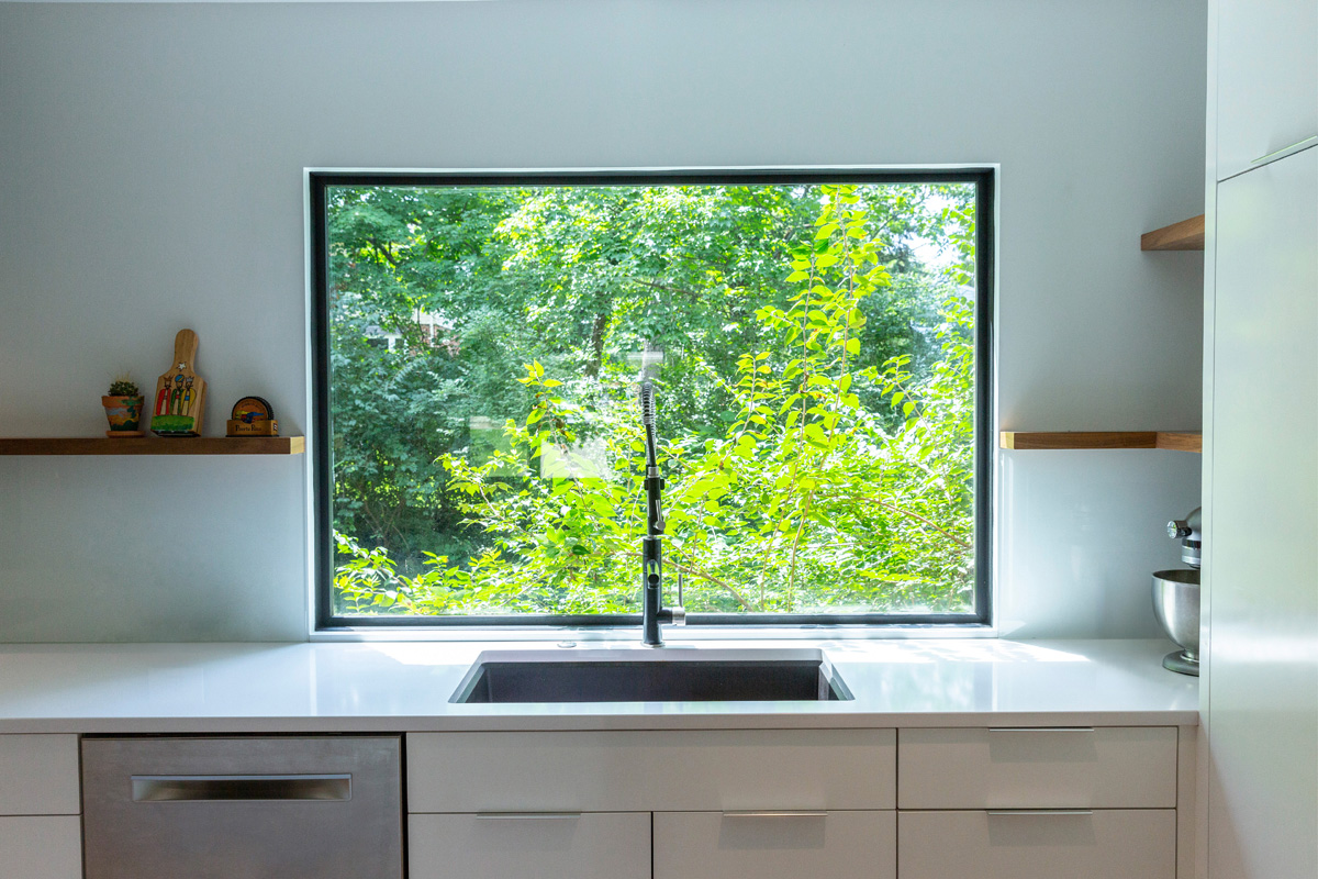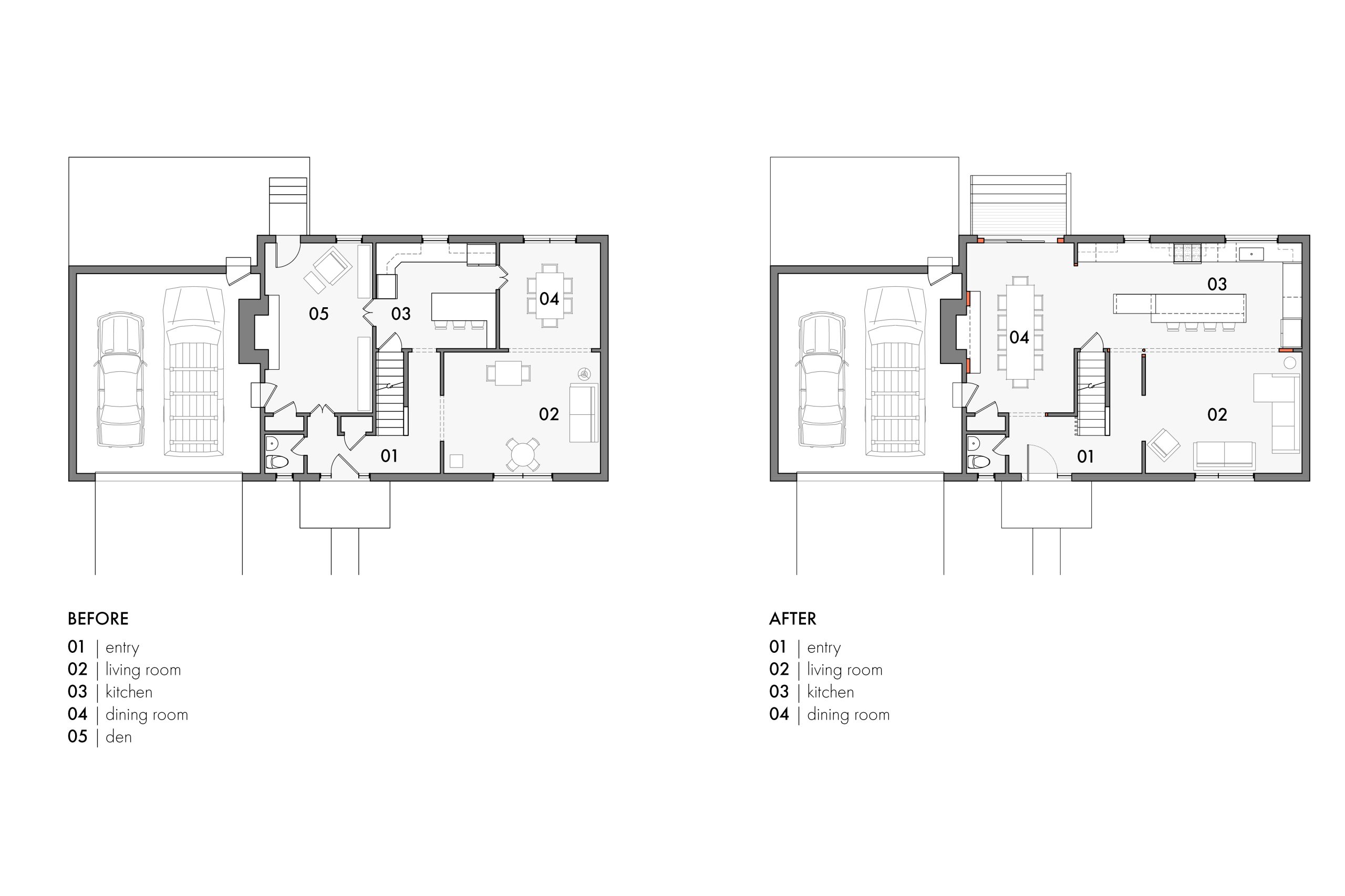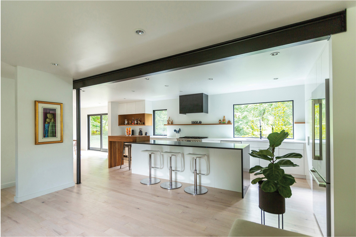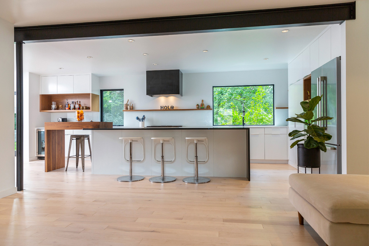 Since an addition was not financially feasible, existing spaces were consolidated and interior walls were removed, including the central loadbearing wall, which was replaced by an exposed column and beam that are now celebrated as key design elements. The once fragmented floor plan is completely open and the isolated kitchen is now visible to both the adjacent dining room and living room.