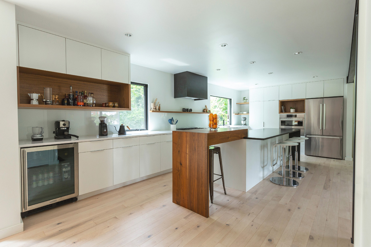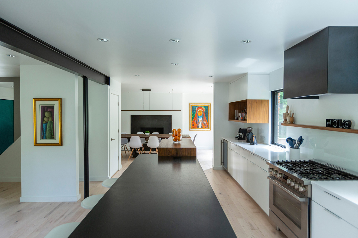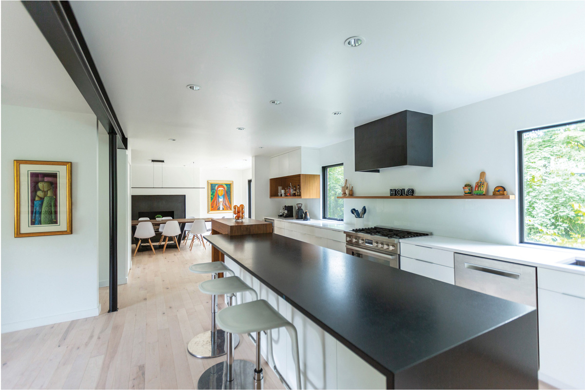 The kitchen features a distinctive work zone defined by the large island that welcomes guests and serves as the centerpiece – and bar! – for every gathering. An all-white interior amplifies the sense of spaciousness and brightness as spaces flow one from another, showcasing the homeowners’ colorful artwork. Wood and steel detailing are judiciously integrated to add warmth and personality.