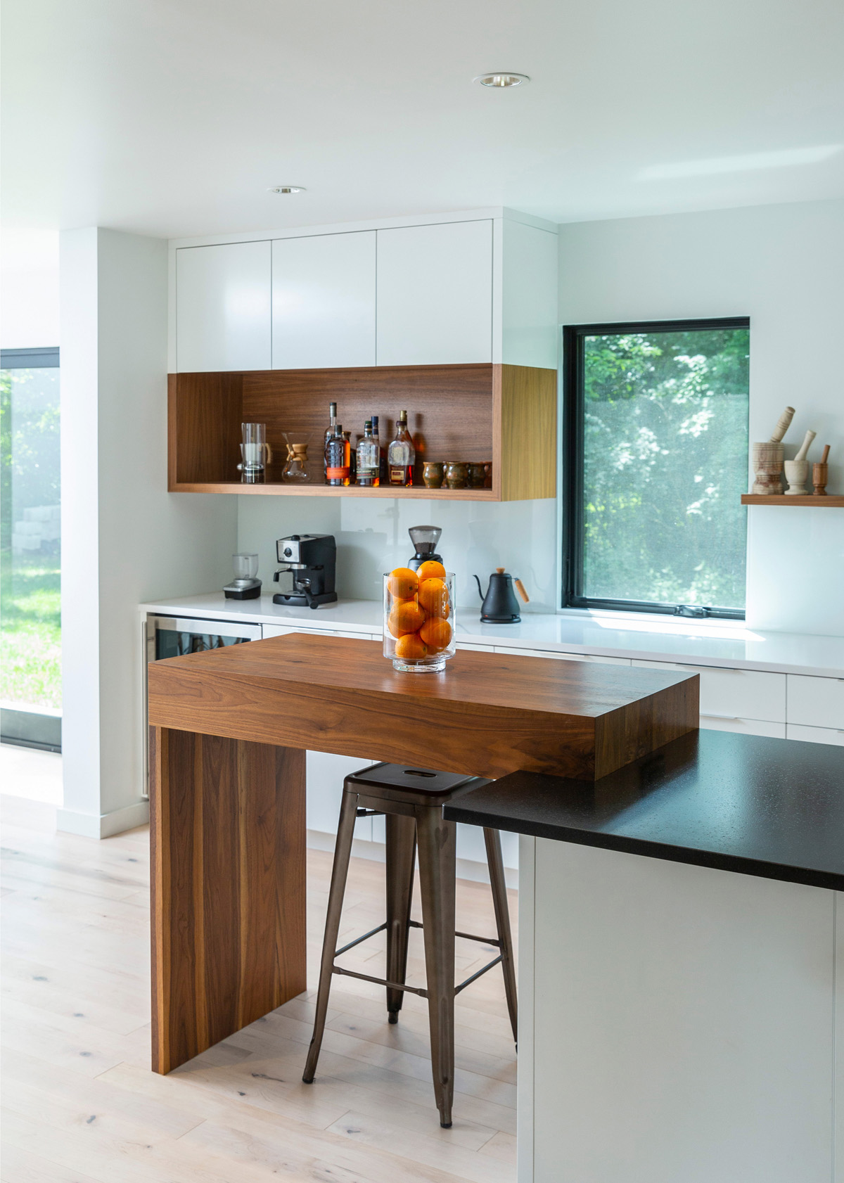 While the majority of the cabinets are white with a clean, flat-panel door style, shelving, inserts and island prep area punctuate the space with rich wood tones. Along the back wall, a Bosch Dual Fuel Range is situated between two windows, paired with a Futuro Lombardy Black Wall Range Hood. A Bosch dishwasher and Marvel Undercounter Beverage Center are also featured along this expanse. The kitchen also incorporates a speed oven, microwave, warming drawer and refrigerator/freezer, all from Bosch.