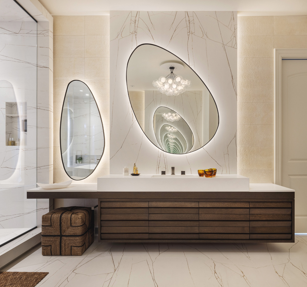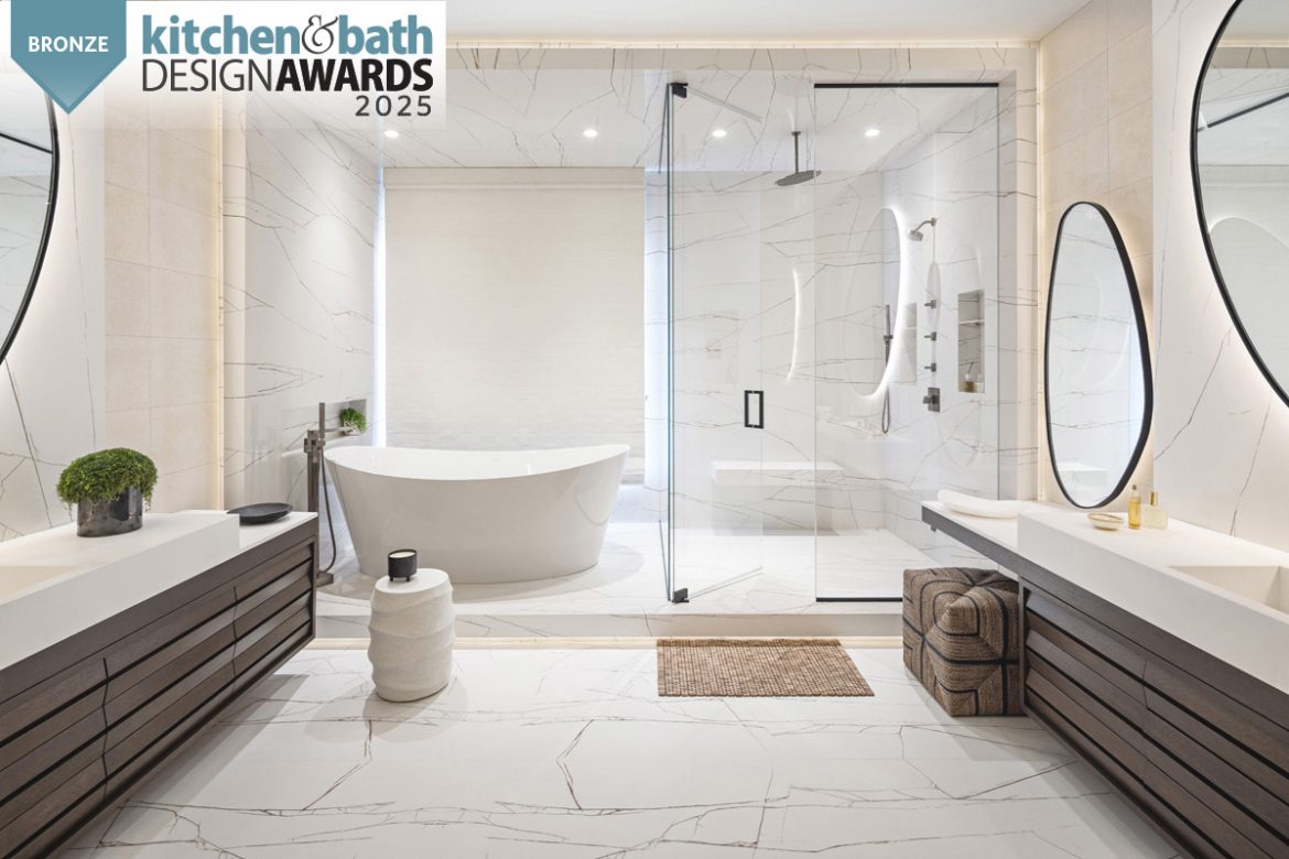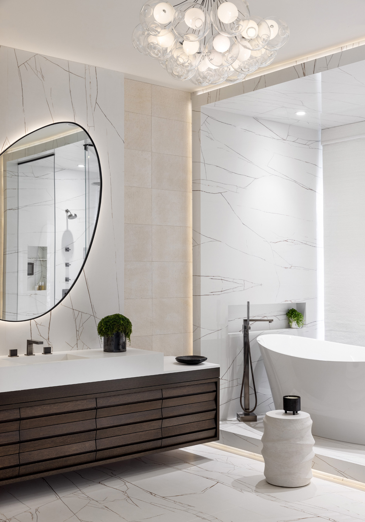 Drawing inspiration from nature, Armina Kasprowicz set out to create a spa-like retreat in the master bathroom for her Clarkston, MI, clients. The sophisticated design incorporates a palette of natural textures, warm earth tones and gentle lighting emanating from behind the large-format stone and tile-clad vanity wall.