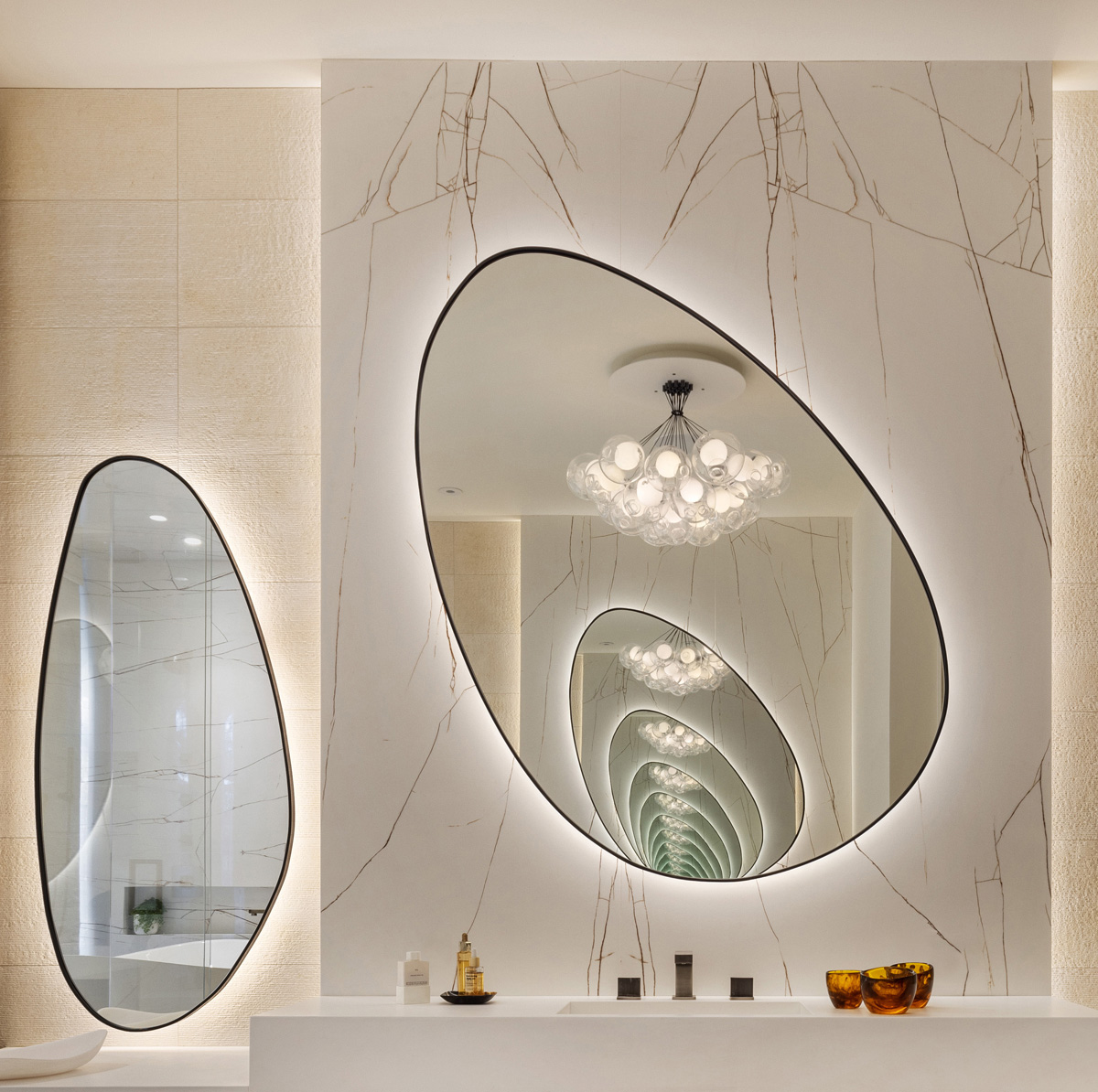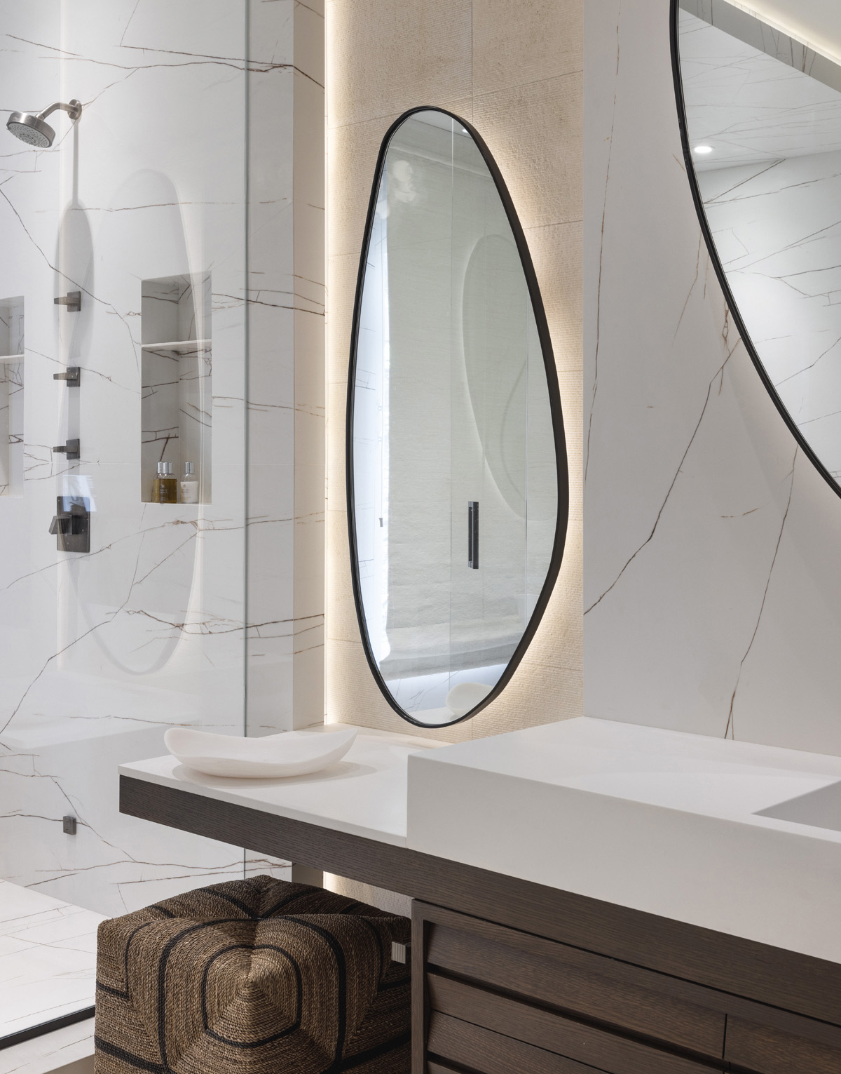 To enhance the spa-like experience, the space features a wet room fitted with a BainUltra Freestanding Evanescence Oval Soaking Tub with a heated backrest, Phylrich fittings in Pewter, and a multi-head ThermaSol Pro Series Master Steam shower. The area is sheathed with Antolini porcelain Sahara Blanc Atech, which is also the flooring throughout the bath, and includes an Infinity shower drain in Matte Black.