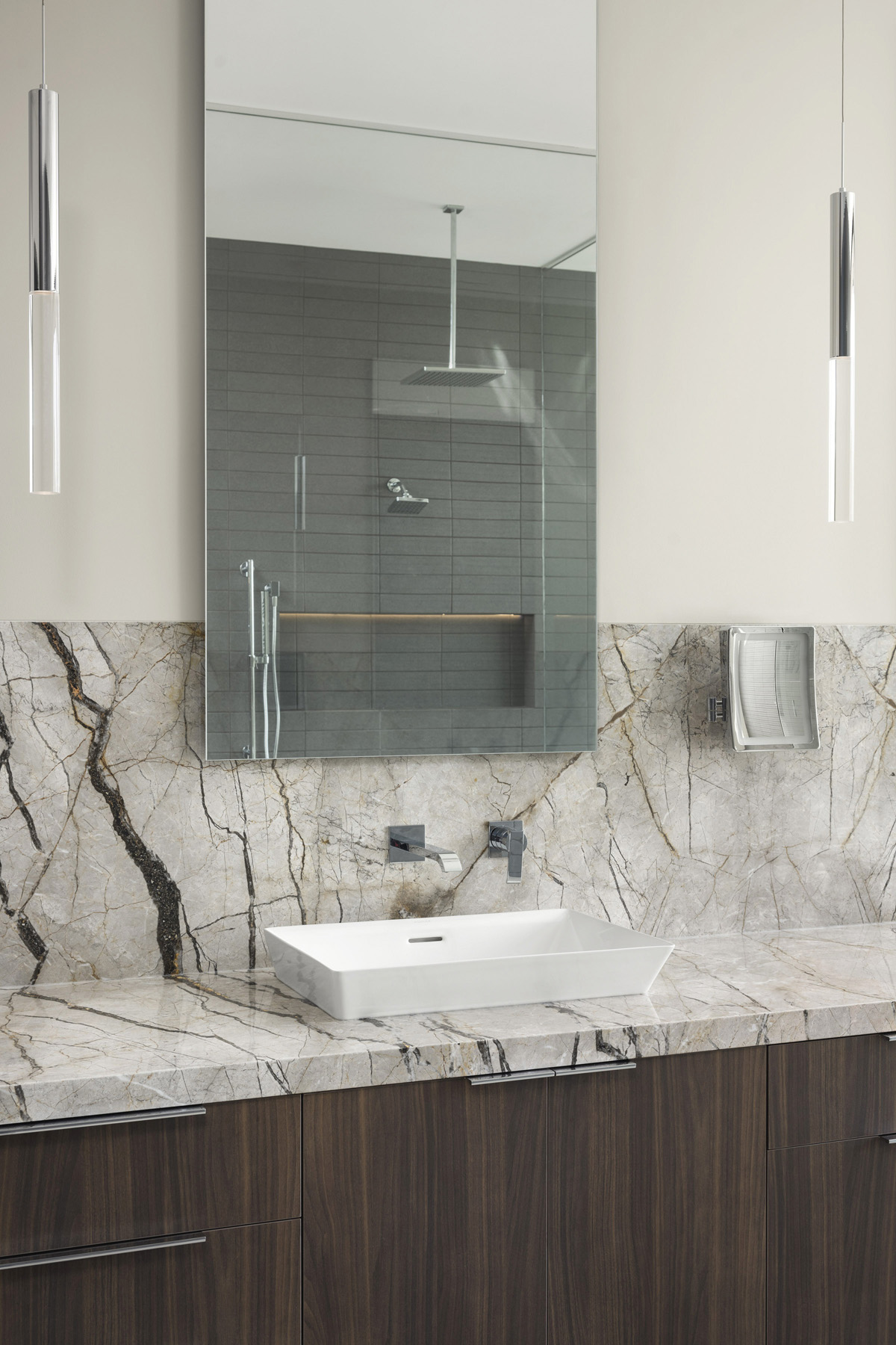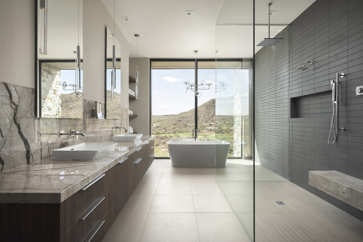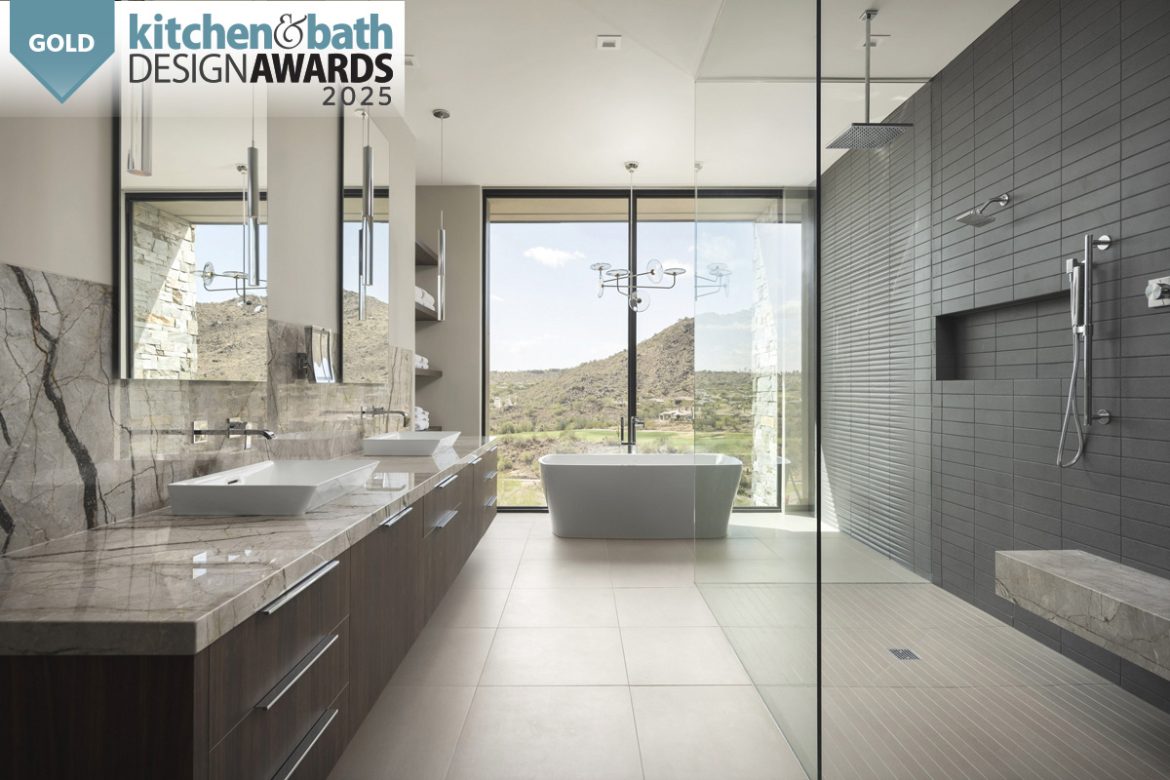 The goal for creating the spa-like bathroom in this new build perched on a ridge overlooking a golf course in Fountain Hills, AZ was to bring the feel of the Sonoran desert experience inside. To highlight the varied greens of the Arizona desert and the golf fairway, Amy Klosterman and Michelle Jefferson used an off-black tile from WOW Tile, a custom walnut melamine vanity, Silver Roots marble and the sparkle of glass shower panels and lighting to create a rich and balanced color story. The BainUltra tub is set right on the window for some sunset sips of wine.