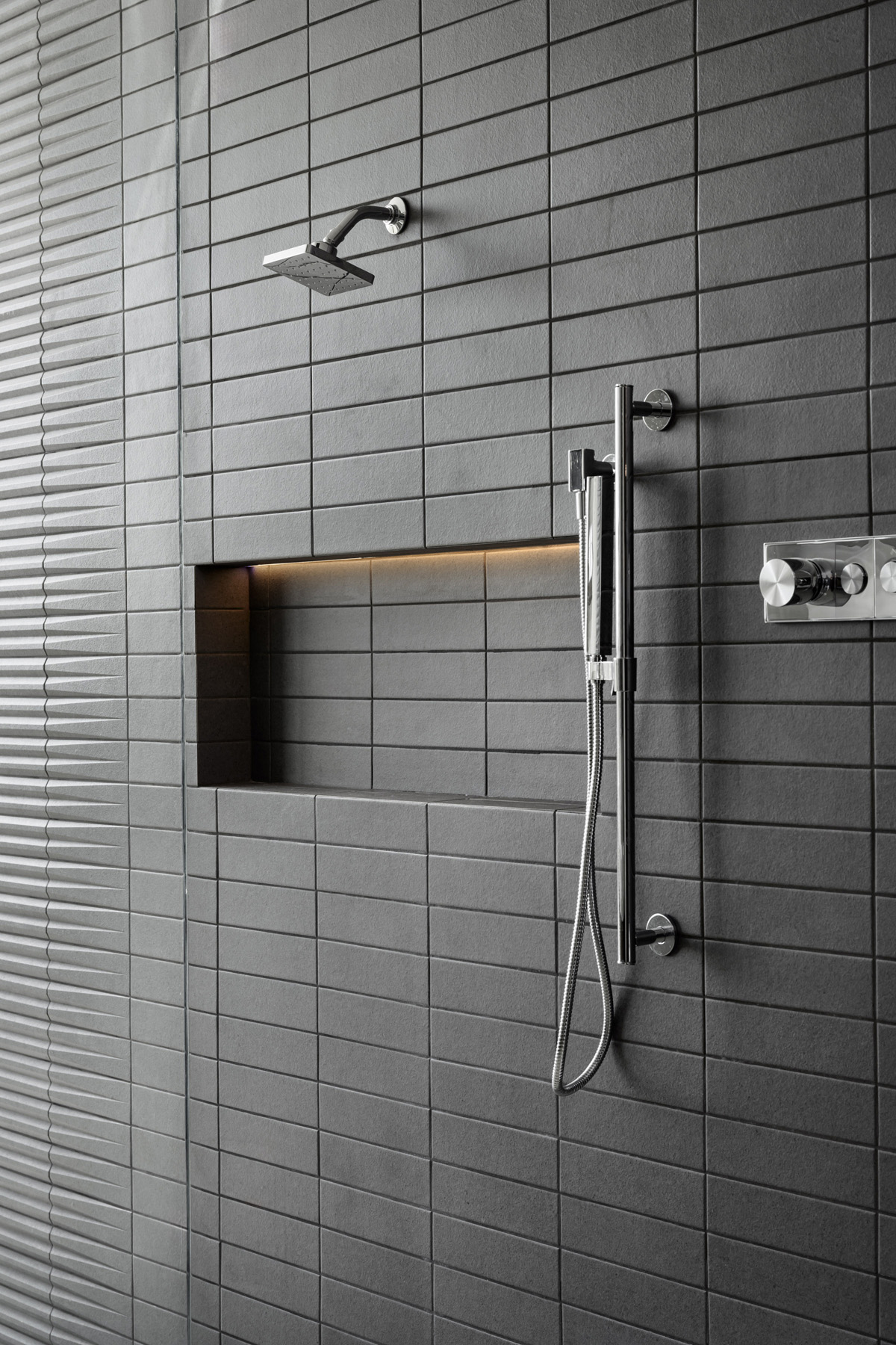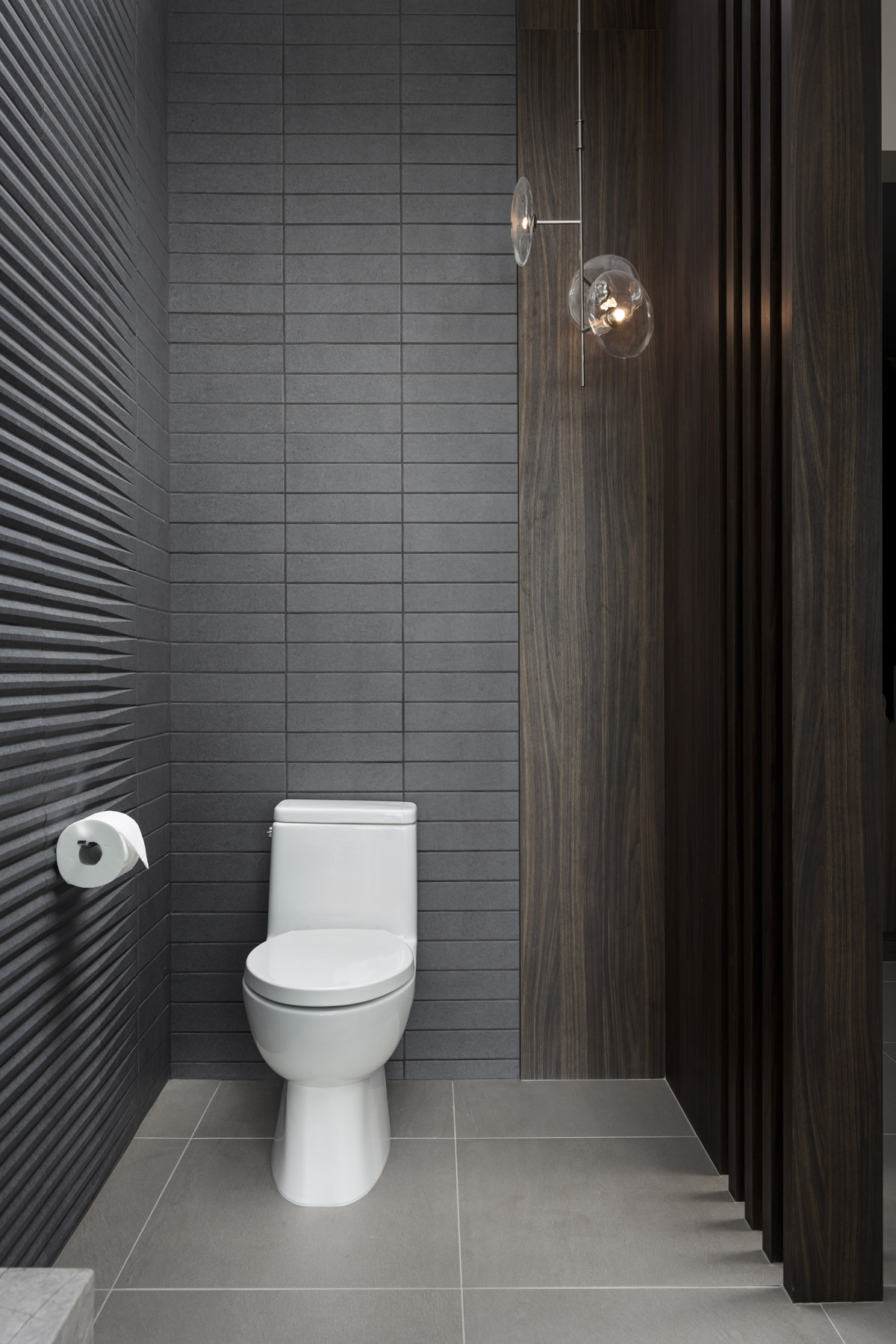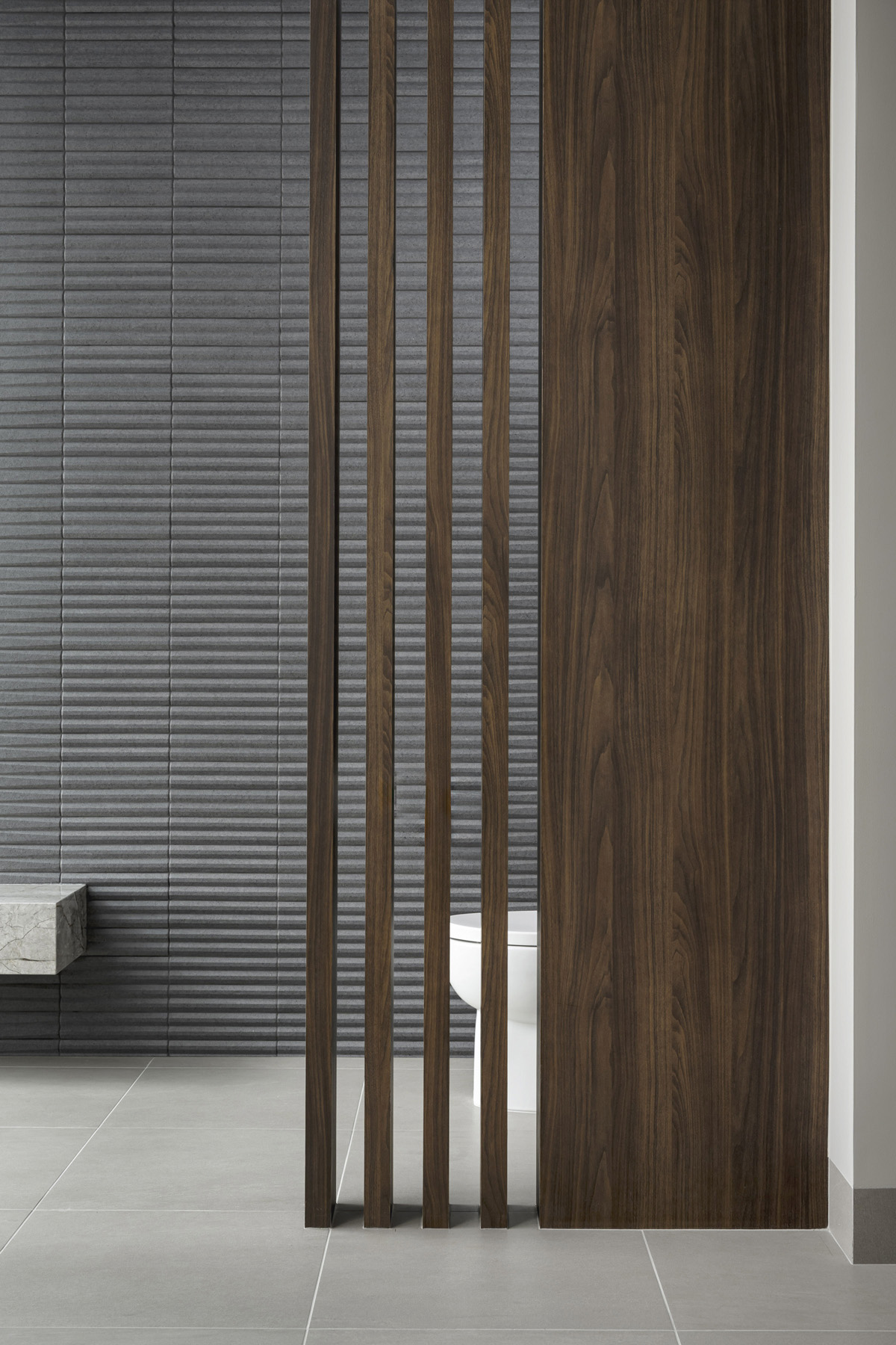 One of the challenges faced by the design team was that the clients wanted a wide open water closet with no privacy needed. They chose to partially separate the Kohler toilet area from the master bedroom with a slatted wall since there were views from the bathroom through the master, out to the pool and patio area. They clad the slats with the same Cleaf walnut melamine material that is used on the vanity and transitioned it to flat paneling within the toilet area. Then, they transitioned to black tile, which took on its own patterning as it traveled around the bathroom, so it all integrated harmoniously. Ginger accessories and Kohler fittings balance the space.