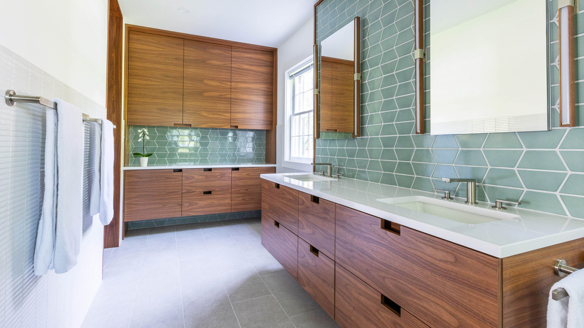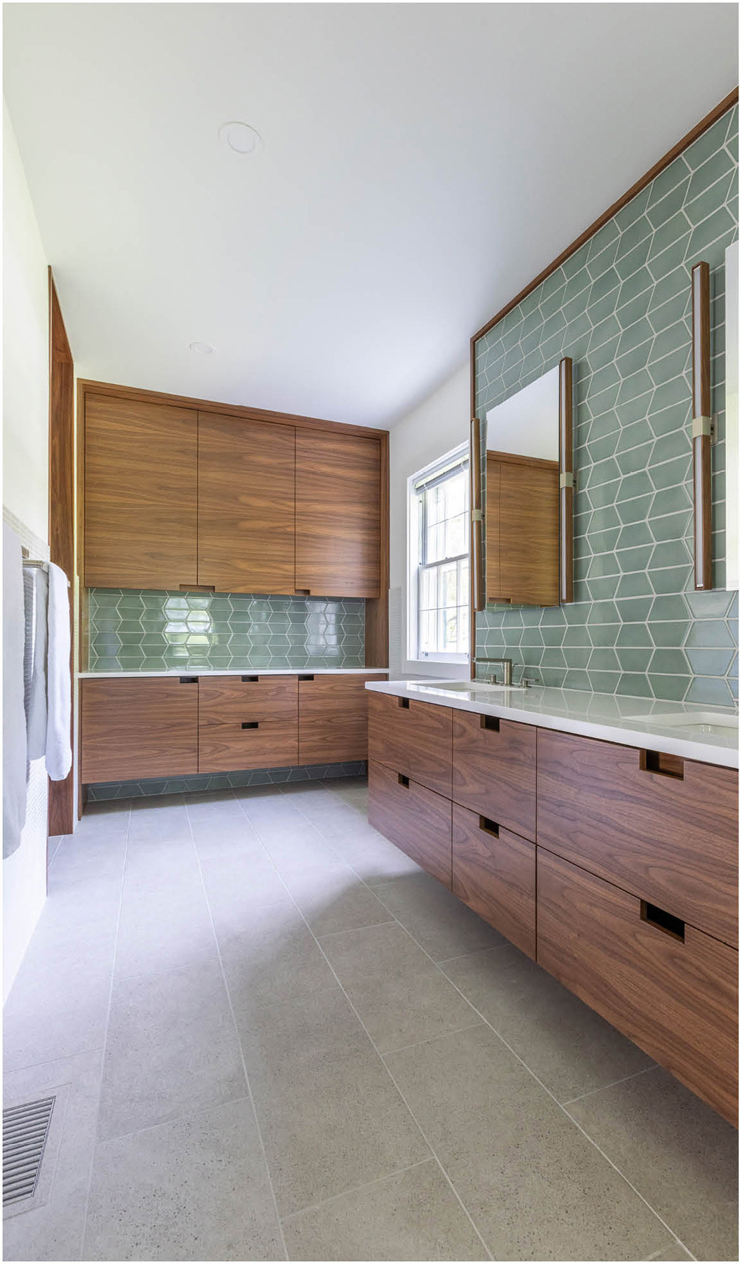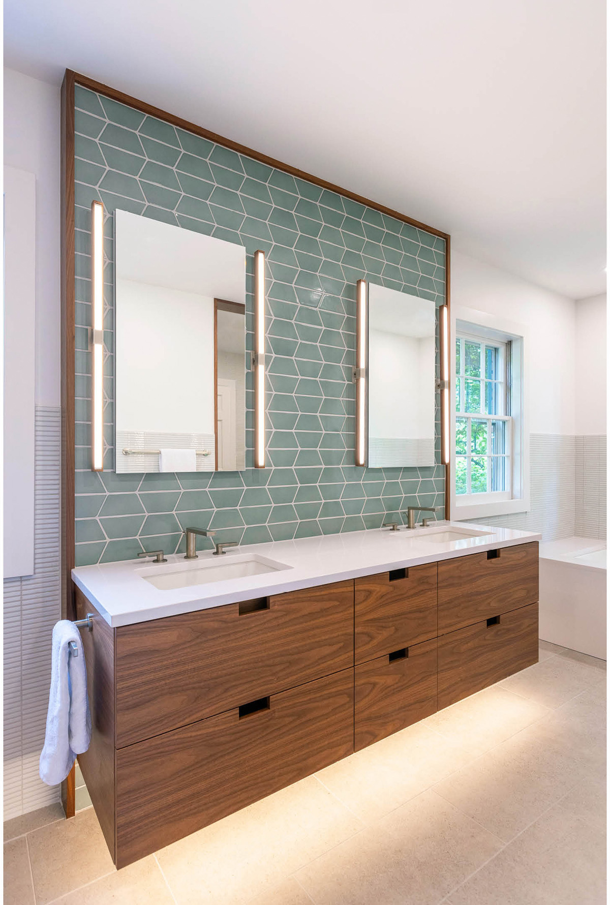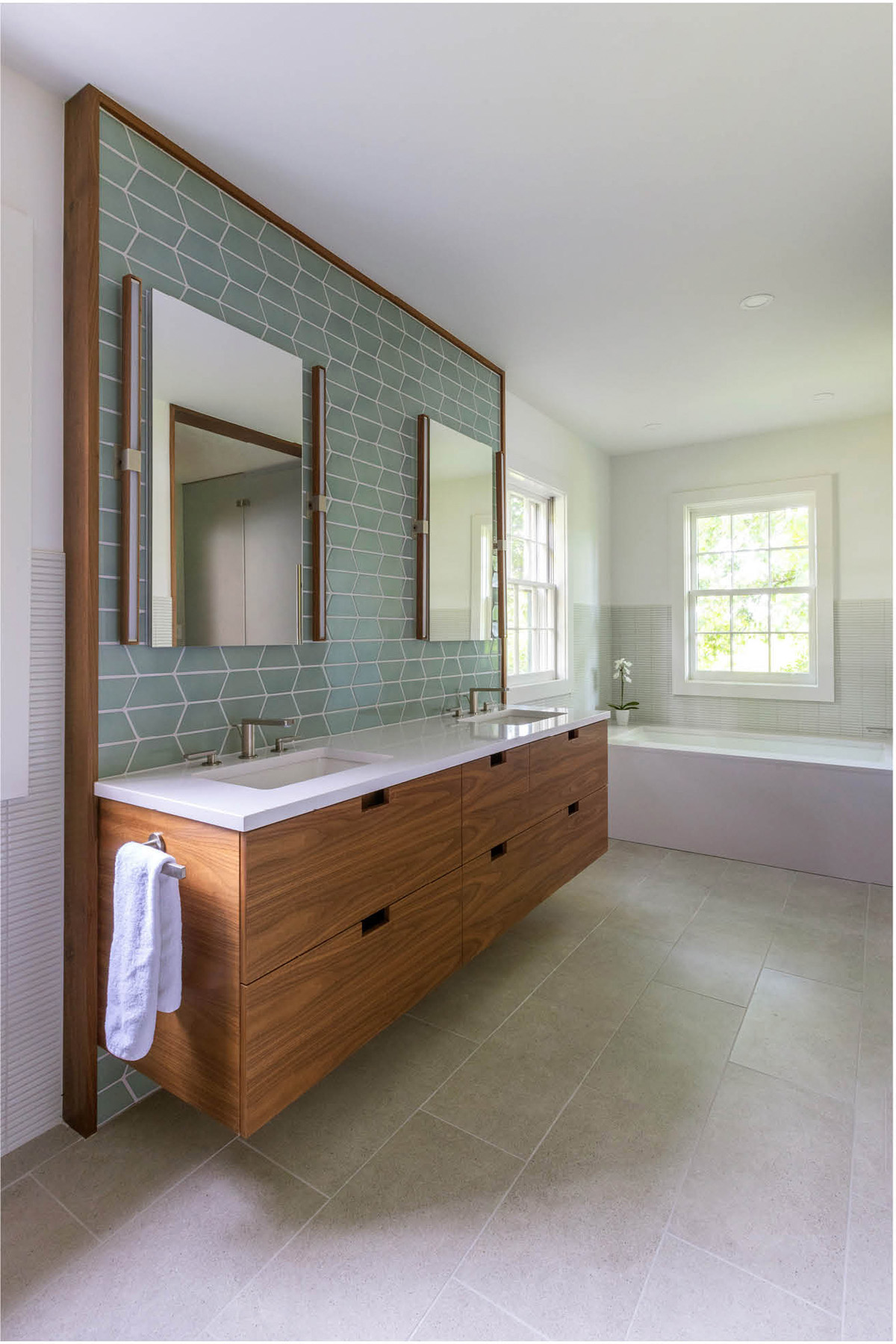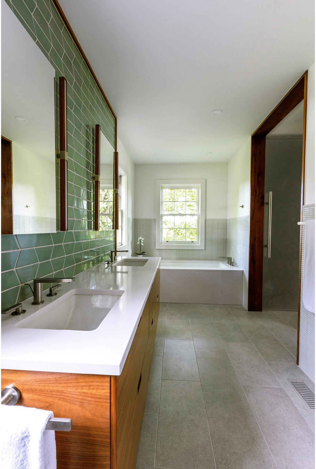 A new window was added above the Kohler Underscore soaking tub with Hansgrohe Talis tub filler to bring in morning light. Finishes such as Silestone quartz surfacing from Cosentino in White Storm, warm walnut custom cabinetry with Kohler sink and faucet and green Roca CC Mosaics+ tile reminiscent of the original 1950s palette strike a balance between modern and mid-century heritage.