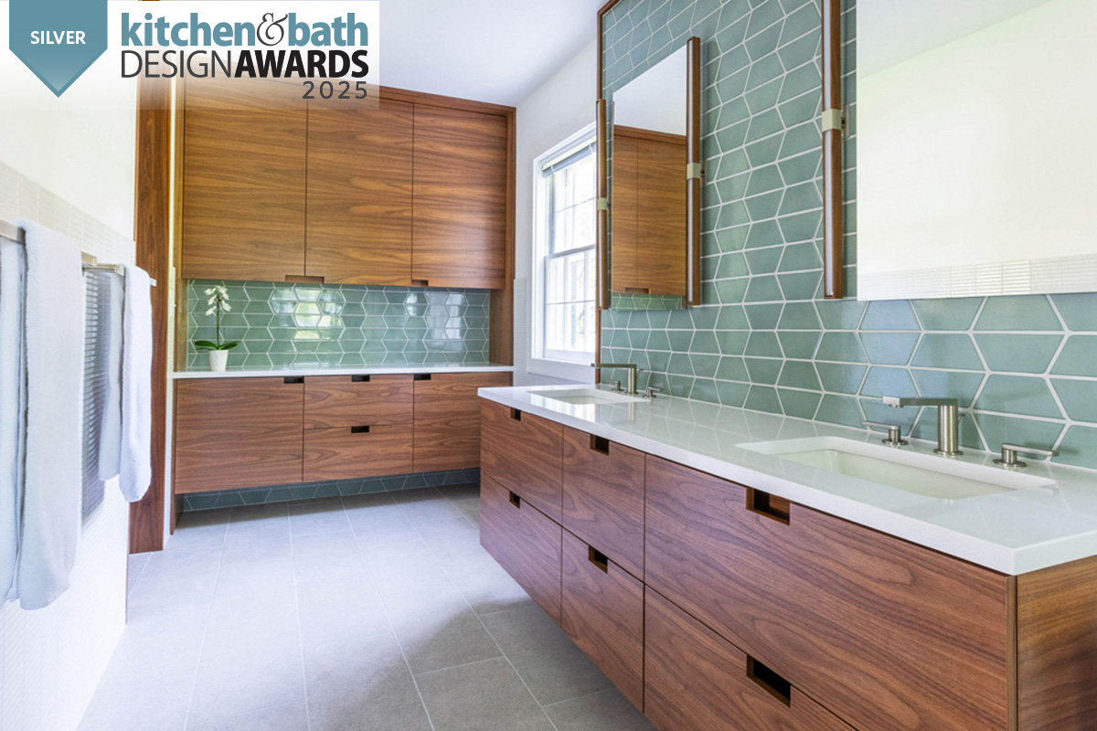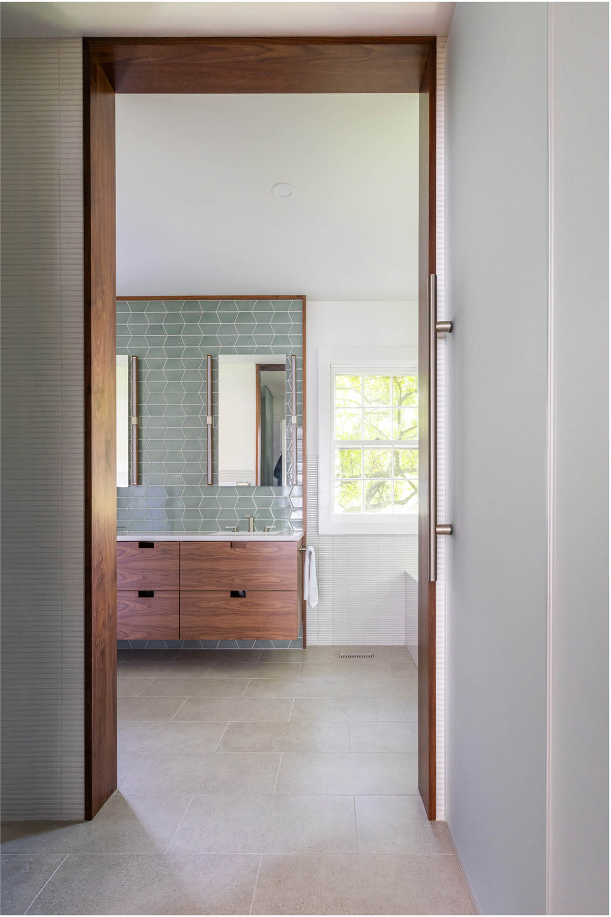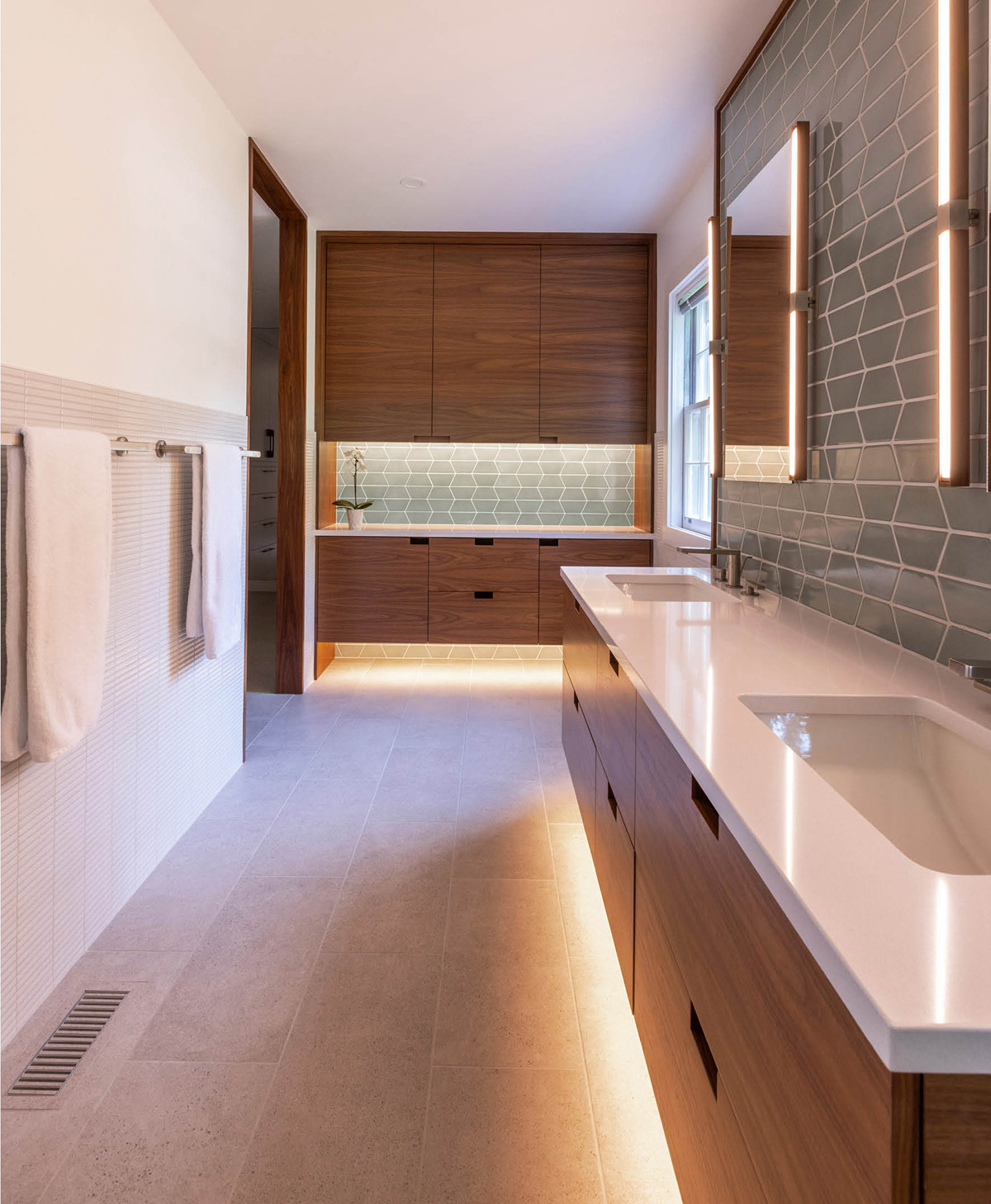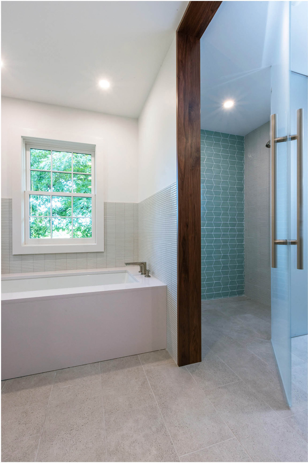 A new window was added above the Kohler Underscore soaking tub with Hansgrohe Talis tub filler to bring in morning light. Finishes such as Silestone quartz surfacing from Cosentino in White Storm, warm walnut custom cabinetry with Kohler sink and faucet and green Roca CC Mosaics+ tile reminiscent of the original 1950s palette strike a balance between modern and mid-century heritage.