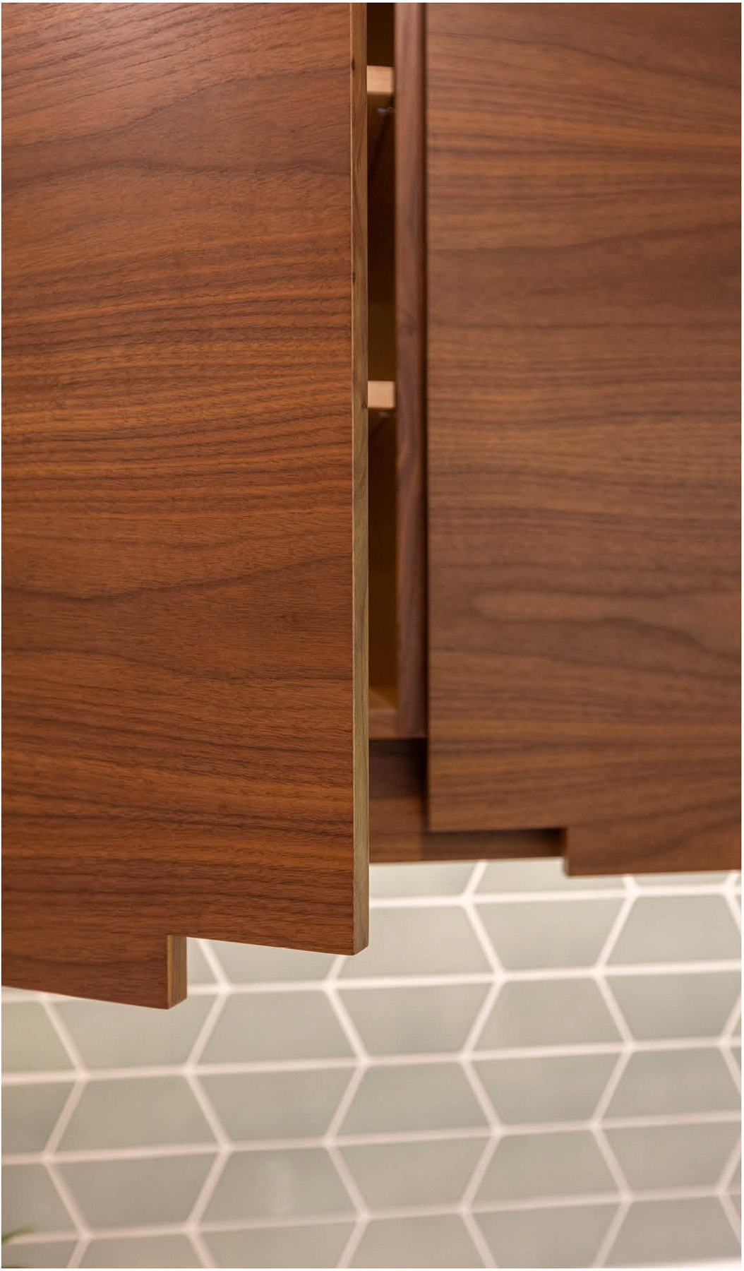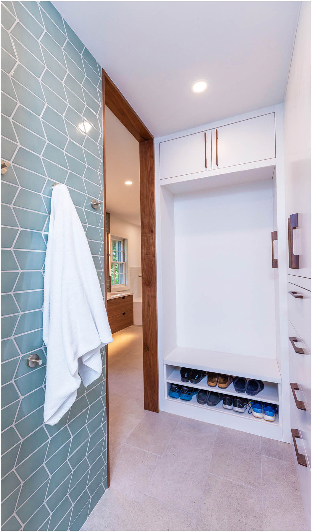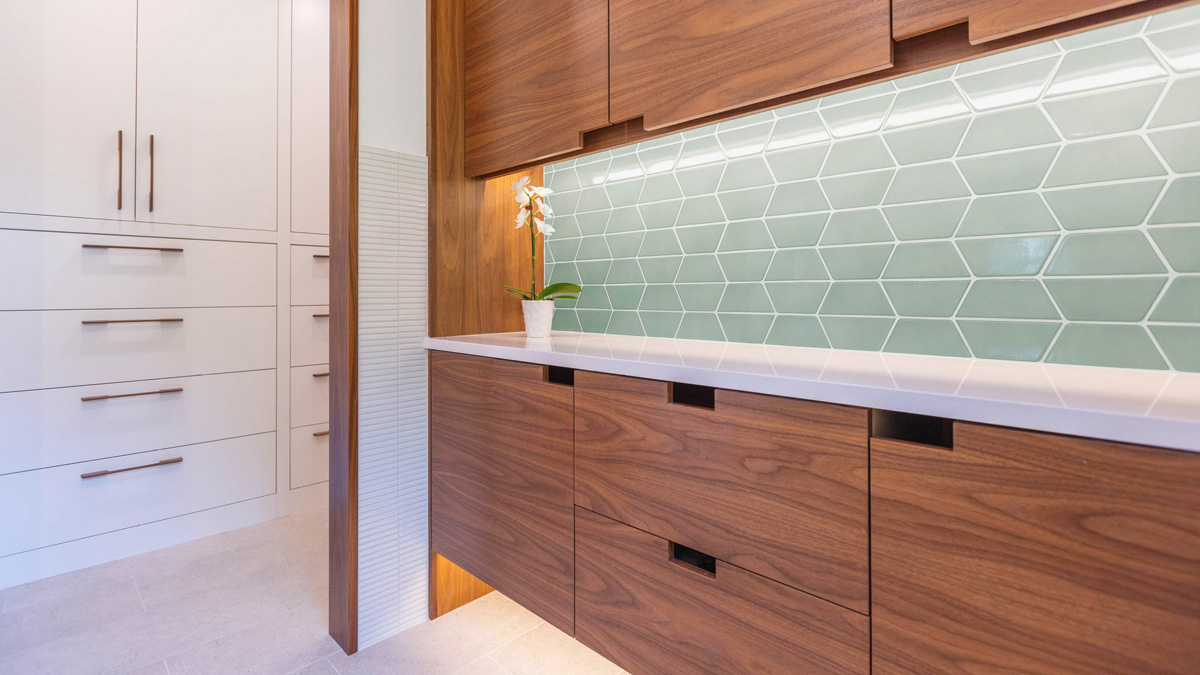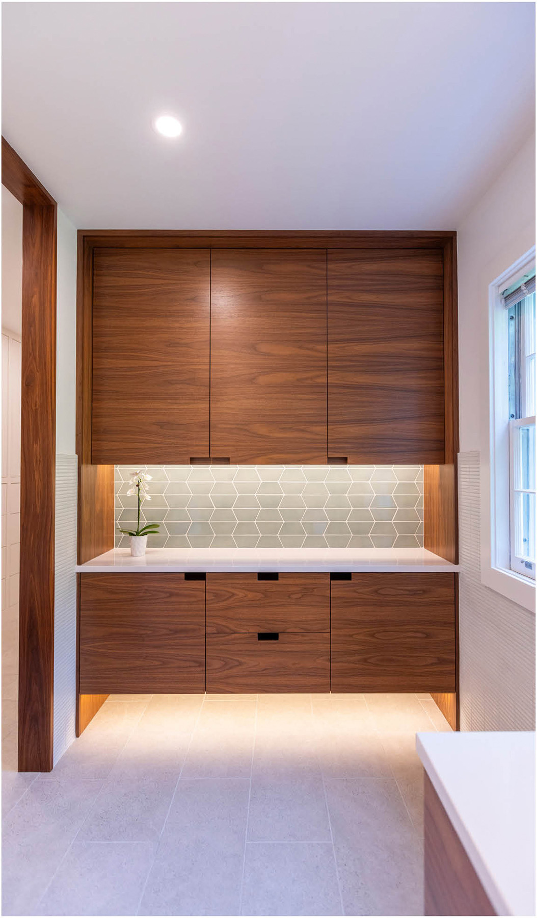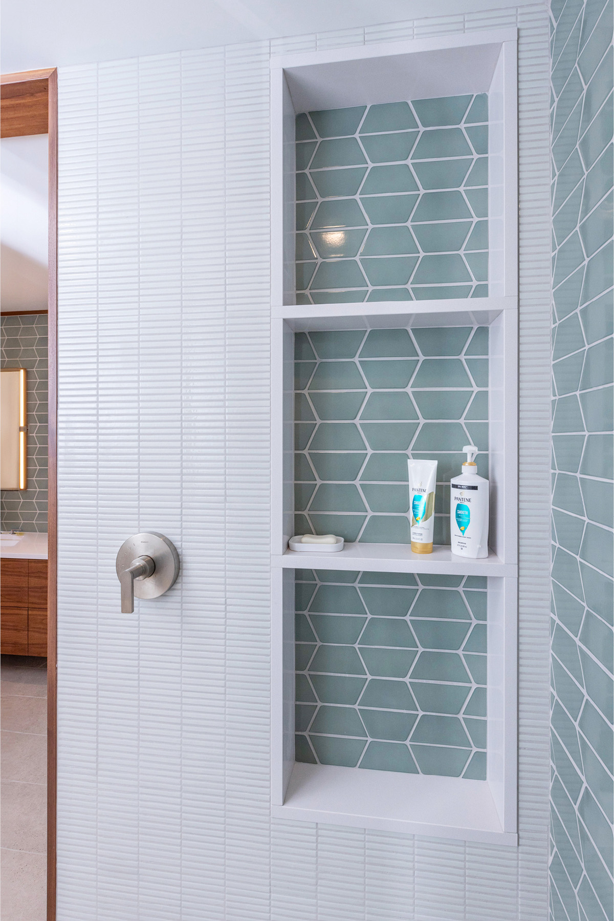 A new window was added above the Kohler Underscore soaking tub with Hansgrohe Talis tub filler to bring in morning light. Finishes such as Silestone quartz surfacing from Cosentino in White Storm, warm walnut custom cabinetry with Kohler sink and faucet and green Roca CC Mosaics+ tile reminiscent of the original 1950s palette strike a balance between modern and mid-century heritage.
